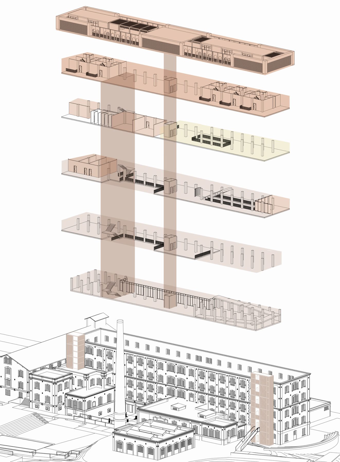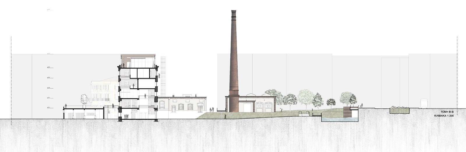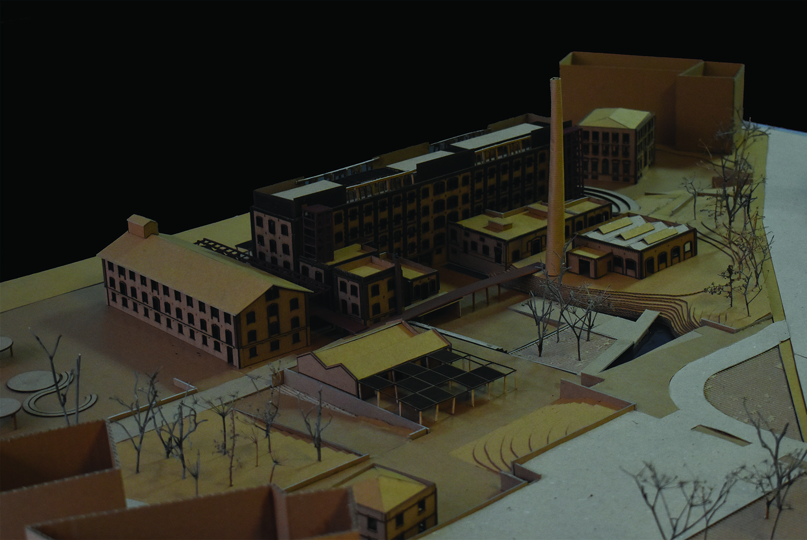 As a starting point, the decision is made to preserve the shells of the buildings that have withstood the passage of time, while keeping the traces of the demolished ones, reminding us of the industrial past.