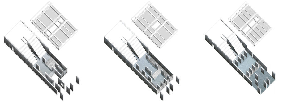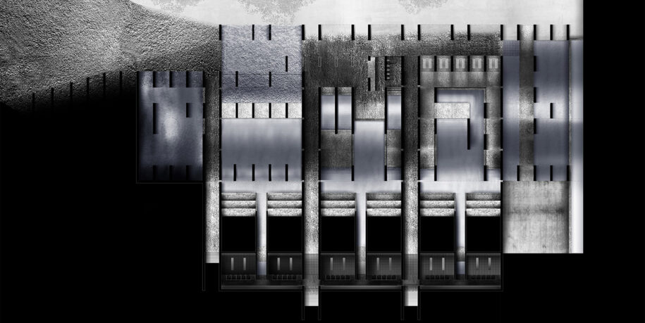 The dipole of bridging and fracturing which permeates the Platonic dialogue is enlarged upon in the planning on two levels. On a primary level the Ilissus fractures the city space, creating a horizontal discontinuity, while six identical museum constructions, the Pharmakeias, function as bridges connecting the two banks. On a secondary level the Ilissus is transformed into a path, which the visitor is invited to walk along, while the Pharmakeias function as fractures which double the time and distance of the walk. The reiterations of the Pharmakeias evoke a process of initiation, where enclosed museum spaces alternate with the riverine landscape.