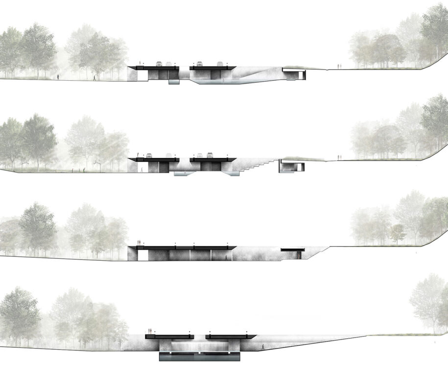 In our proposal, the whole area is excavated and transformed into an open stratigraphical garden, where archaeological remains together with the bed of the Ilissus rise to the surface, while accesses and movements are redefined.