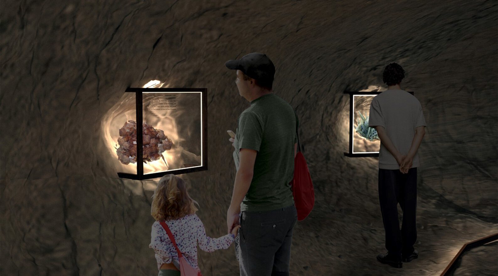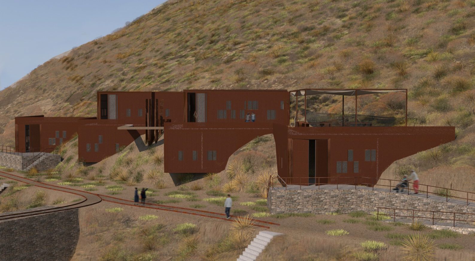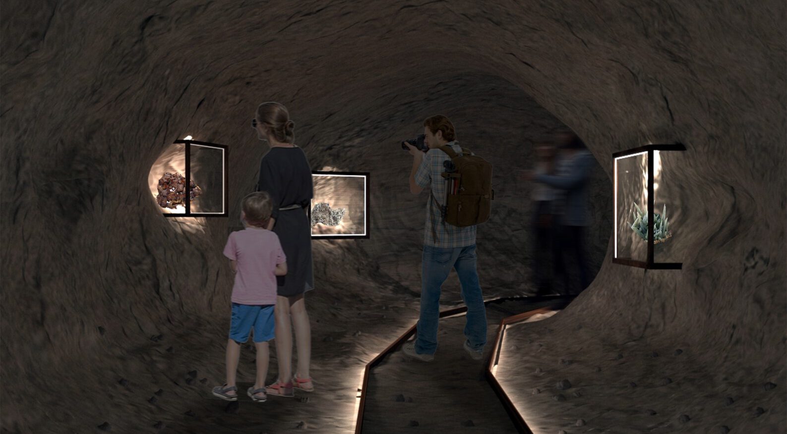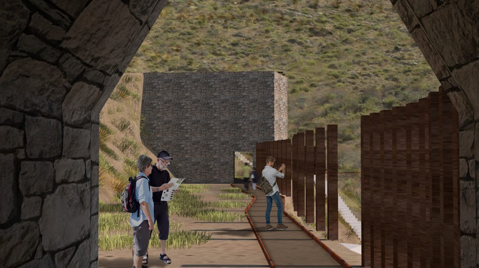 The second route, located at the same level, guides the visitor through paths and viewing stops. Along the route, there are stops along the way, the three pavilions, which are an architectural translation of the local mythology. The third route is located 19 meters above sea level and leads to the cave where metal and precious stones were mined, the experience is enriched by sound stimuli simulating the operation of the mines. The fourth route is located 27 meters above sea level, and leads to the main entrance of the museum commemorating the mining period.