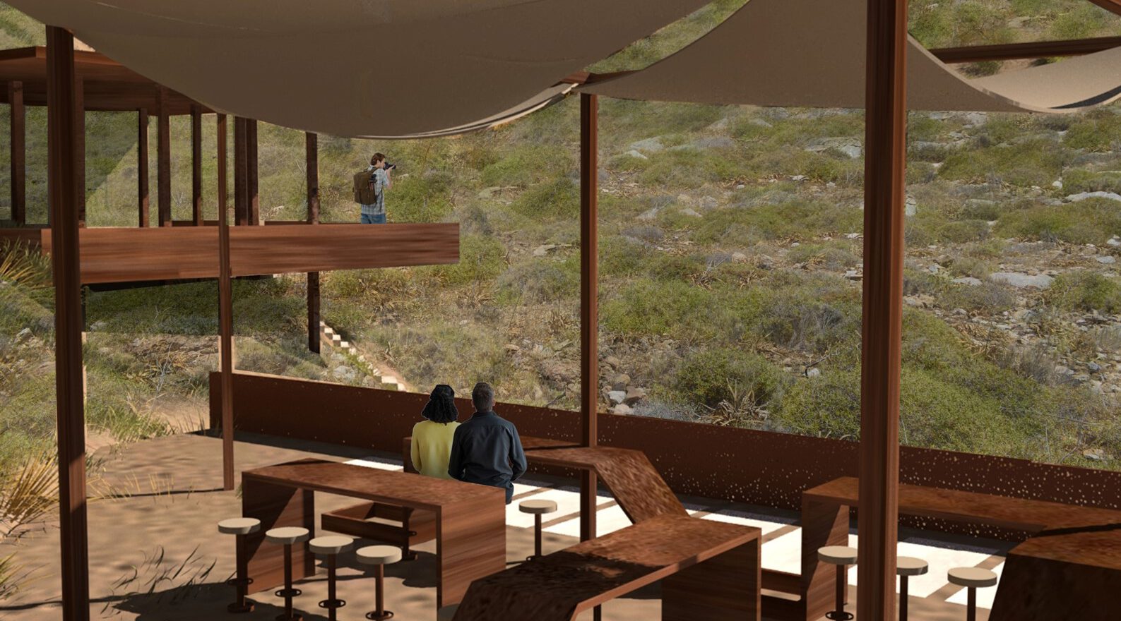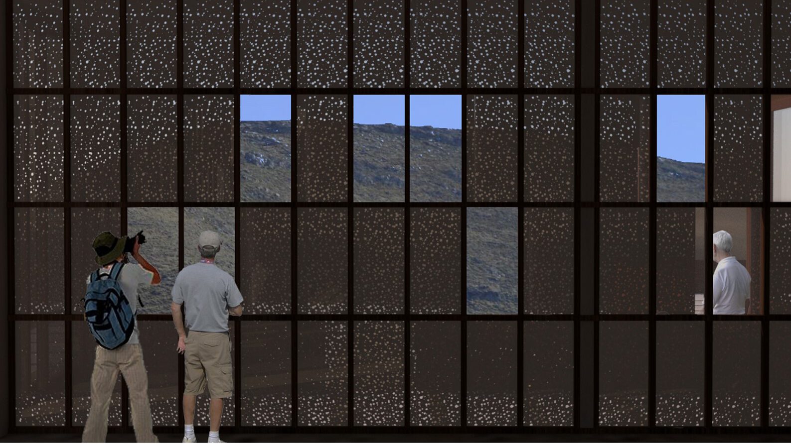 Επίσης η επένδυση από πλάκες διάτρητου corten, με αραιότερη διάτρηση από πάνω προς τα κάτω, που έχει επιλεχθεί για να παραπέμπει στα μεταλλεία της περιοχής, προσομοιώνει την επιδερμίδα του κτιρίου με αυτή του βράχου που κατατρώγεται από την αλμύρα και το κύμα. Το παρατηρητήριο, βρίσκεται στα 35 μέτρα και αποτελεί μια ανεξάρτητη δομή για αστροπαρακολούθηση κατά τους θερινούς μήνες.
