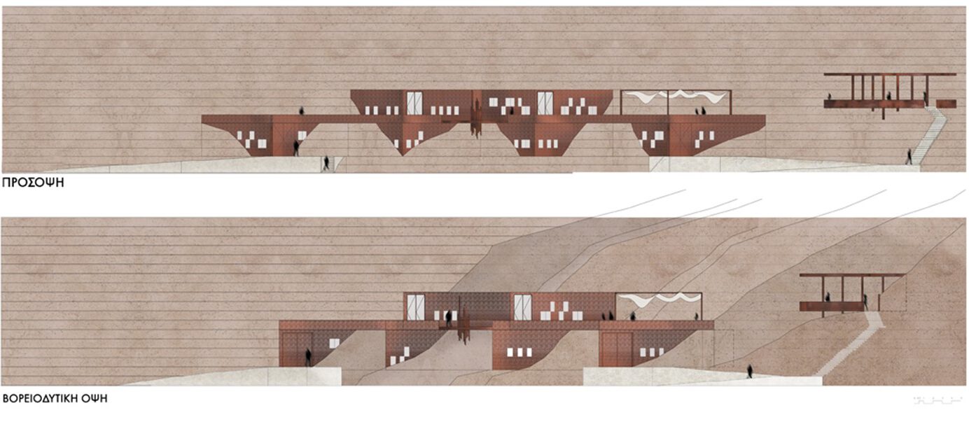 The aim of the project was to create a proposal that would carry the memories of the era to which it refers, while enriching it with a contemporary element, both in its architectural approach and in the subject matter of the exhibits it houses, creating a dialogue between the architecture and the exhibits. The surrounding space of the building becomes central to its architectural concept. Much of the structure is underground, making it appear as a natural extension of the hillside.