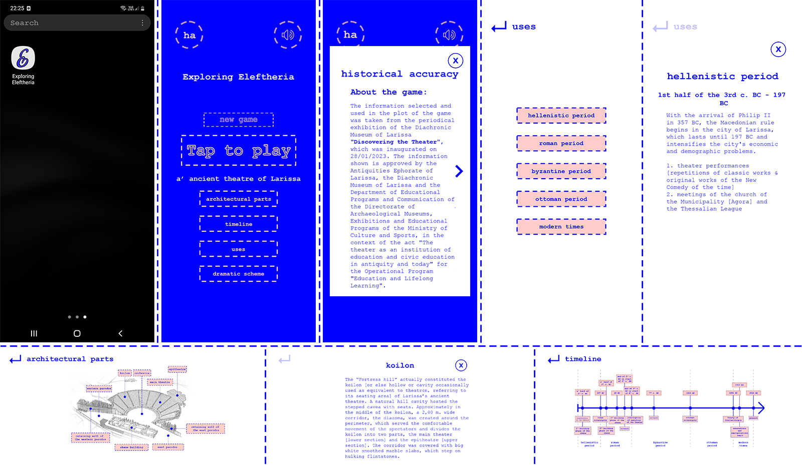 This game offers a linear tour of six points in the archaeological site of the theater. Narratively following the ancient dramatic scheme “hubris, ate, nemesis, tisis, catharsis”, the ancient Greek theater as an institution is explored, along with the first ancient theater of Larissa and the ancient festival of the Eleftheria, which took place at this location.