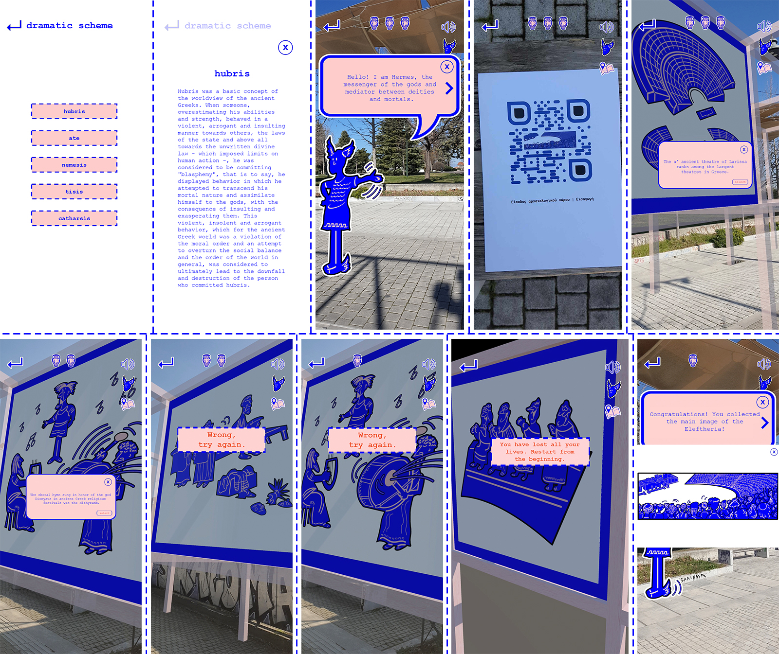 Πρόκειται για ένα παιχνίδι, το οποίο συνιστά μία γραμμική πρόταση περιήγησης έξι σημείων στον αρχαιολογικό χώρο του θεάτρου. Ακολουθώντας αφηγηματικά το αρχαίο δραματικό σχήμα «ύβρις, άτη, νέμεσις, τίσις, κάθαρσις», εξερευνάται το αρχαίο ελληνικό θέατρο ως θεσμός, το α’ αρχαίο θέατρο της Λάρισας και η αρχαία γιορτή των Ελευθέριων, που λάμβανε χώρα στο σημείο αυτό.