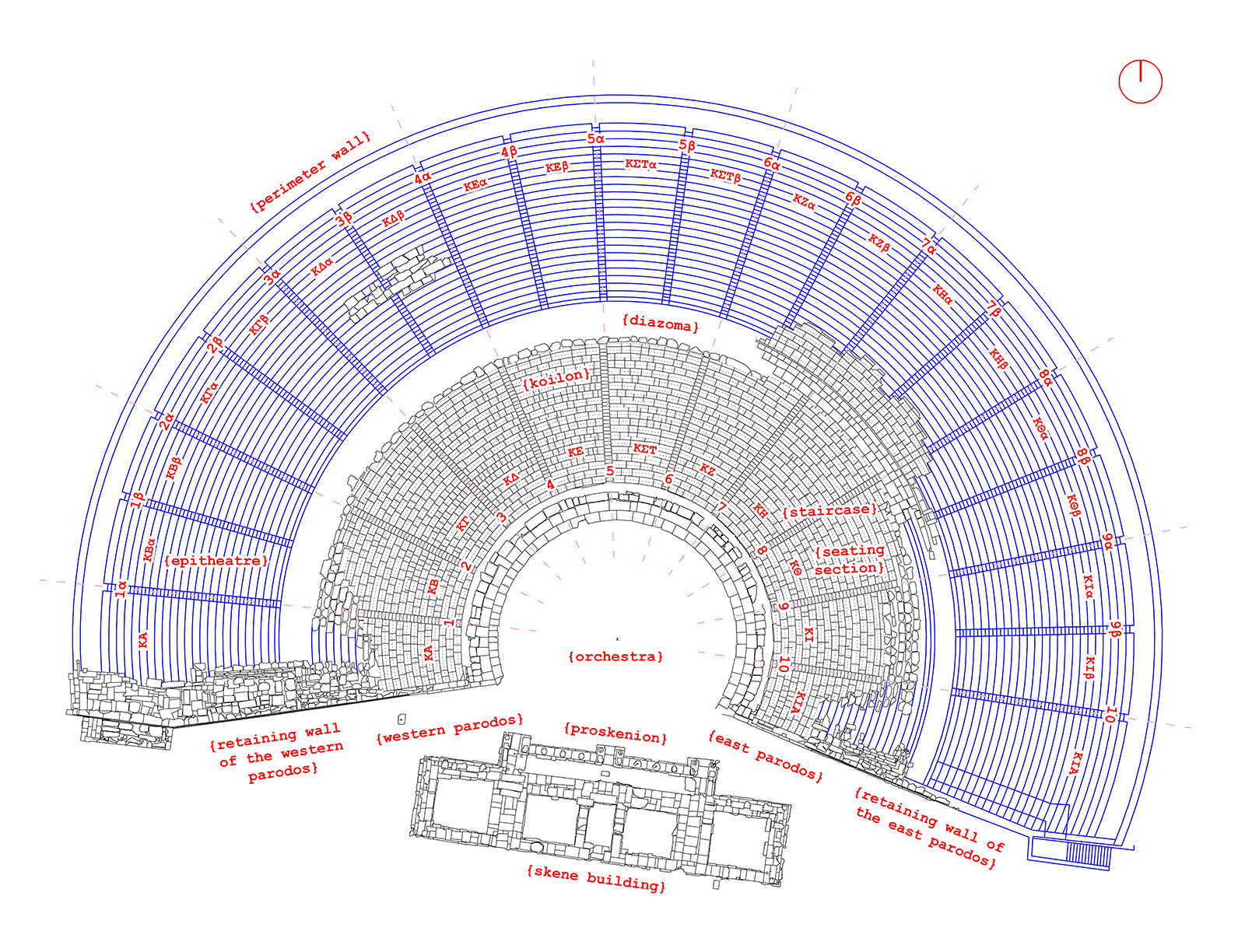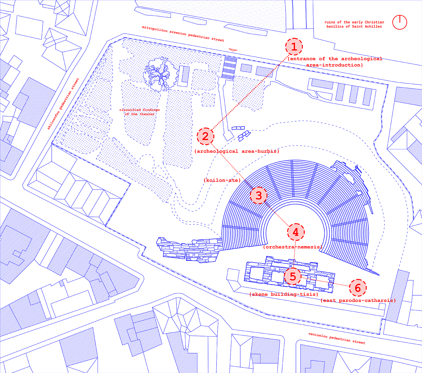 Τρεις αρχές οργάνωσης επιλέχθηκαν για το συγκεκριμένο παράδειγμα: τα σημεία, οι γραμμές και οι επιφάνειες. Ξεκινώντας από τα σημεία, επιλέχθηκαν έξι μέσα στον αρχαιολογικό χώρο, σύμφωνα με την ιστορία και την αρχιτεκτονική του θεάτρου και αποτελούν τη γραμμική πορεία που καλείται να ακολουθήσει ο χρήστης. Το σύνολο των σημείων αυτών δίνει μία διαστατική και οργανωτική ποιότητα στο θέατρο και λειτουργούν ως σημεία αναφοράς.