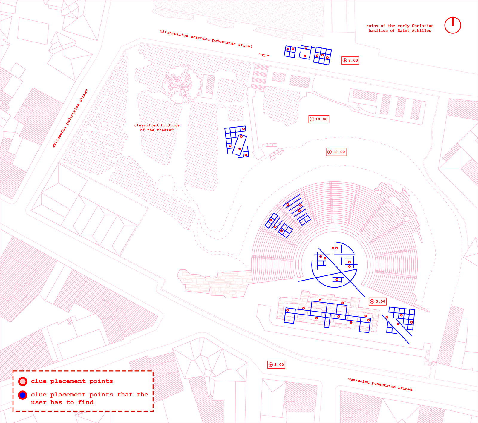 The current design was chosen to contrast with the architecture of the theater by adding a playful character that aligns with the narrative of the game, while maintaining the geometry utilized in the theater’s natural design. Three organizational principles were selected for this project: points, lines, and surfaces. Starting with the points, six spots within the archaeological site were chosen based on the theater’s history and architecture, forming the linear path for the user.