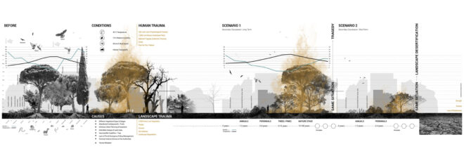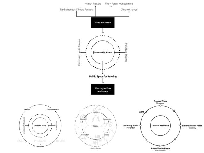 This thesis project focuses on the two traumas that this fire caused, the Human Trauma, the human wound, caused by the fire experiencing, and the loss, and includes the Individual trauma, and the Collective-Community trauma, and the disrupted relationship of people and nature, and the Landscape Trauma, the trauma of the landscape that includes the direct and indirect tangible consequences of the fire, and the indirect tangible landscape degradation, when fires are repeated at relatively short intervals at the same place, and delay its regeneration.