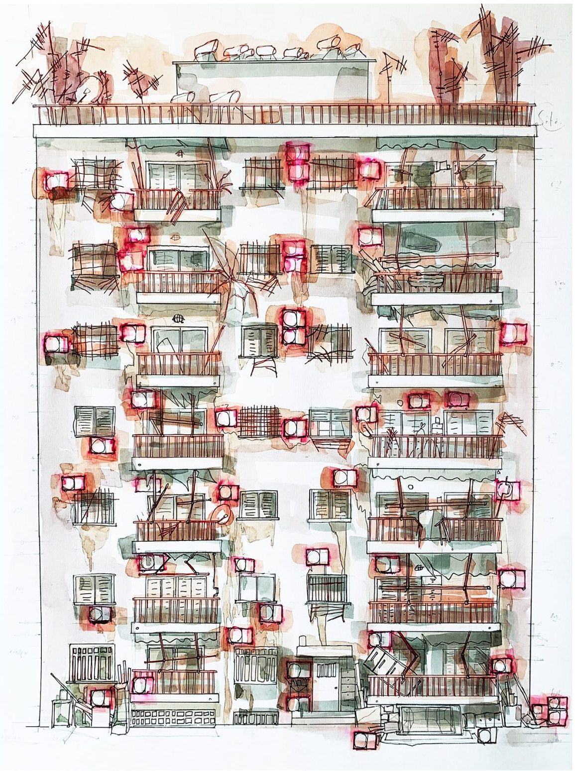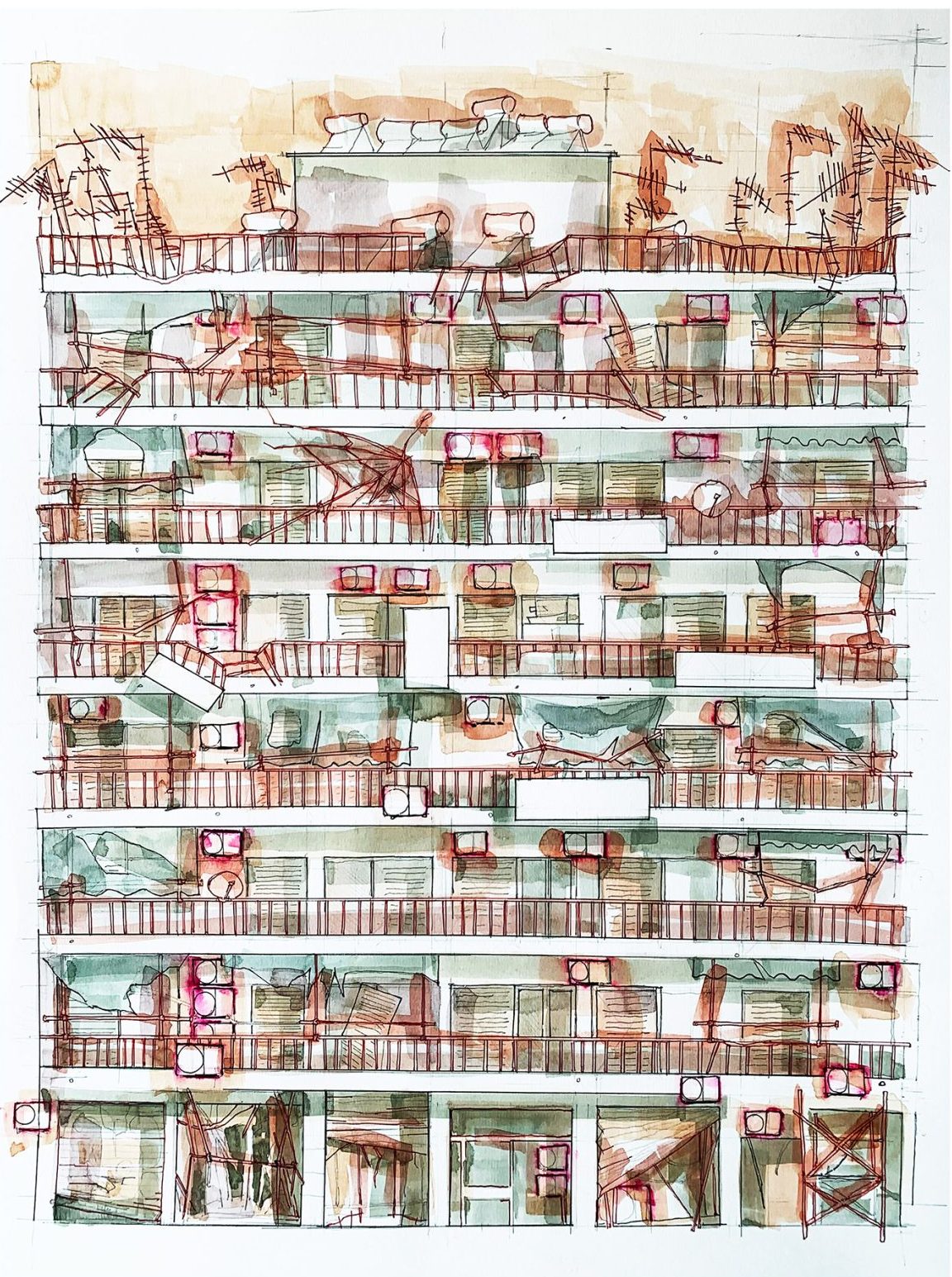 Back view of apartment building. Media: watercolors, ink, pencil.