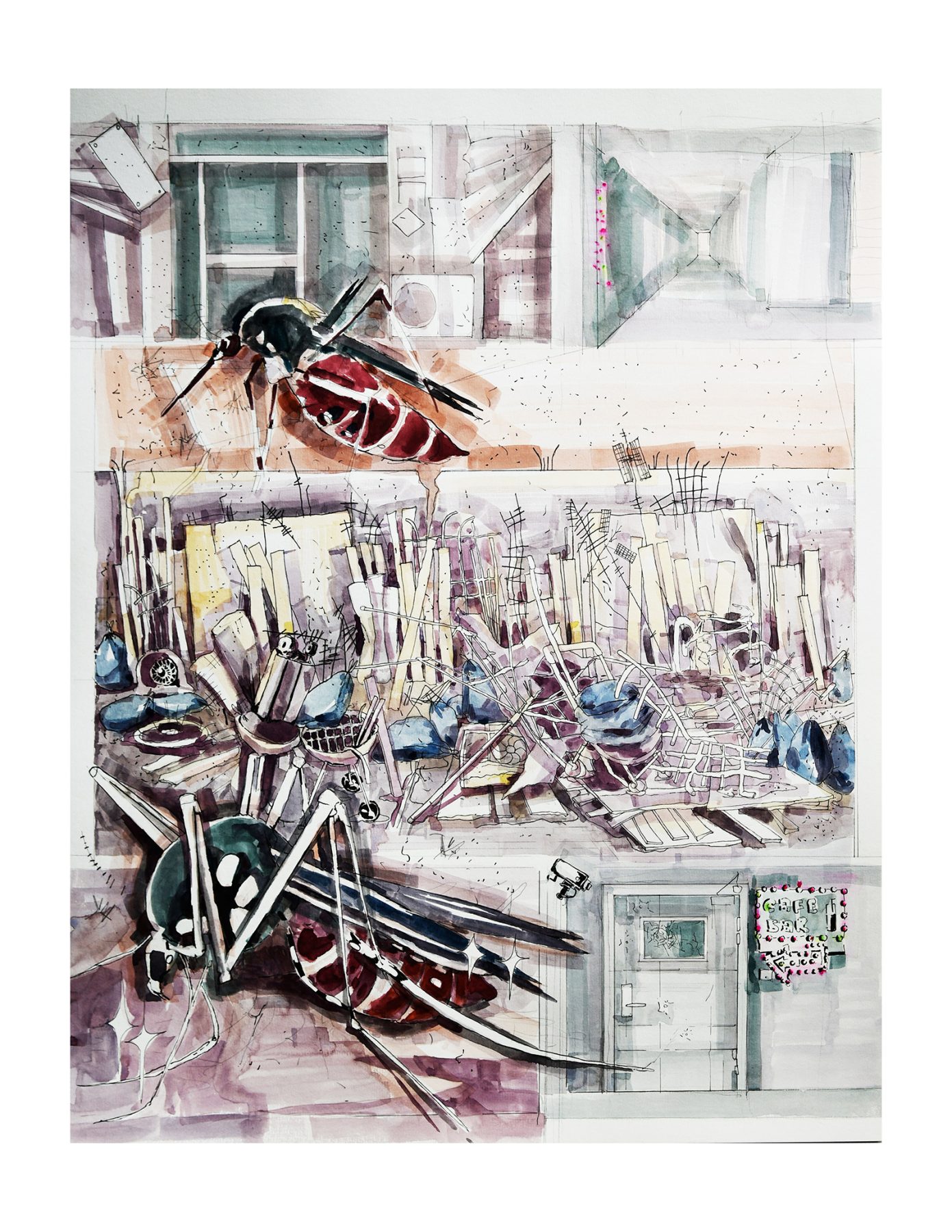 Storyboard: communal space. Media: watercolors, ink, pencil.