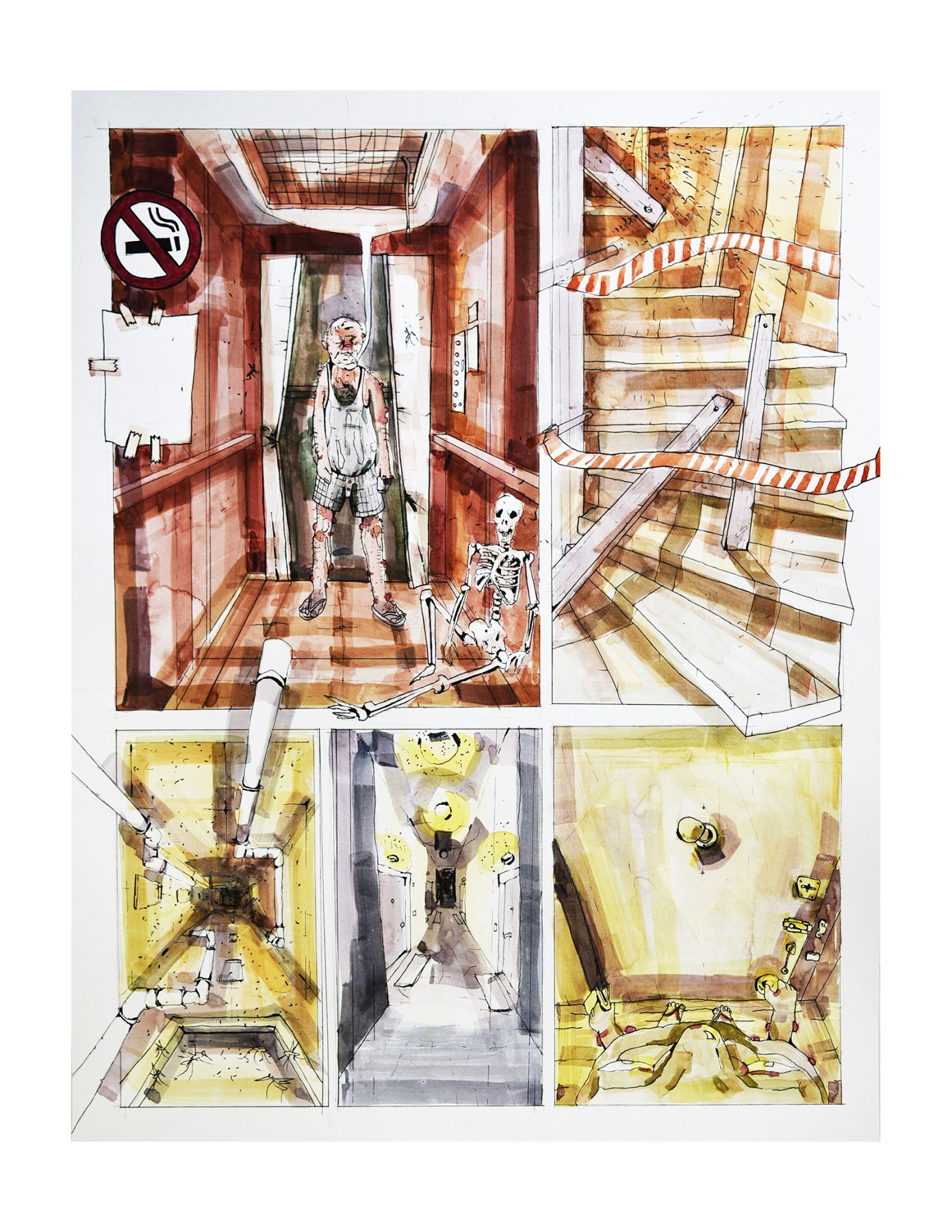 Storyboard: Residential spaces. Media: watercolors, ink, pencil.