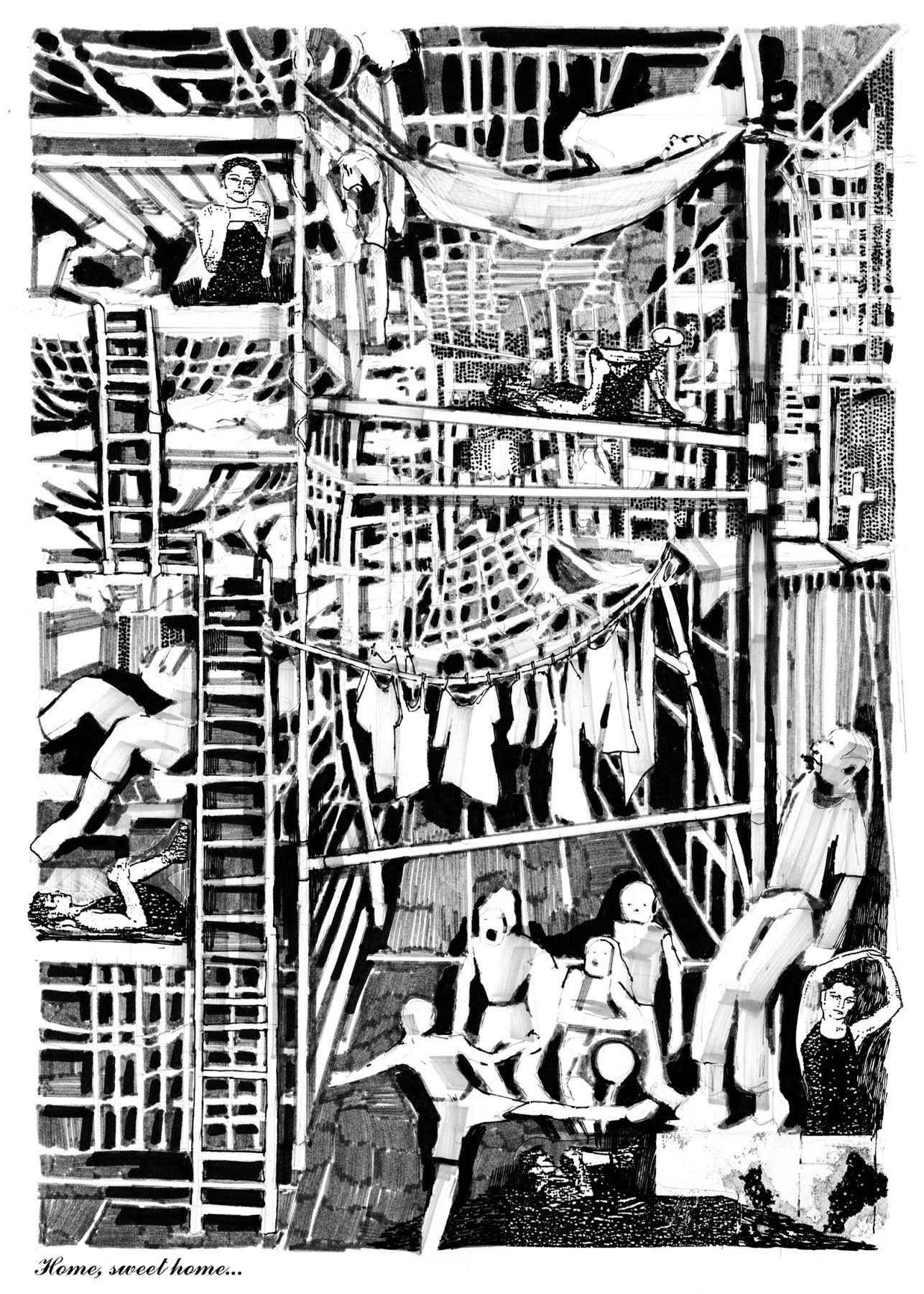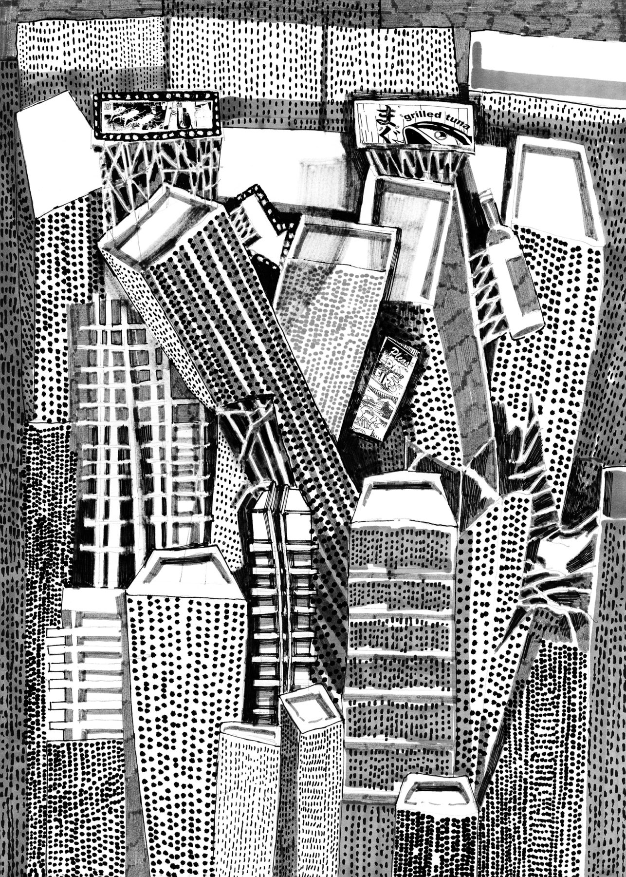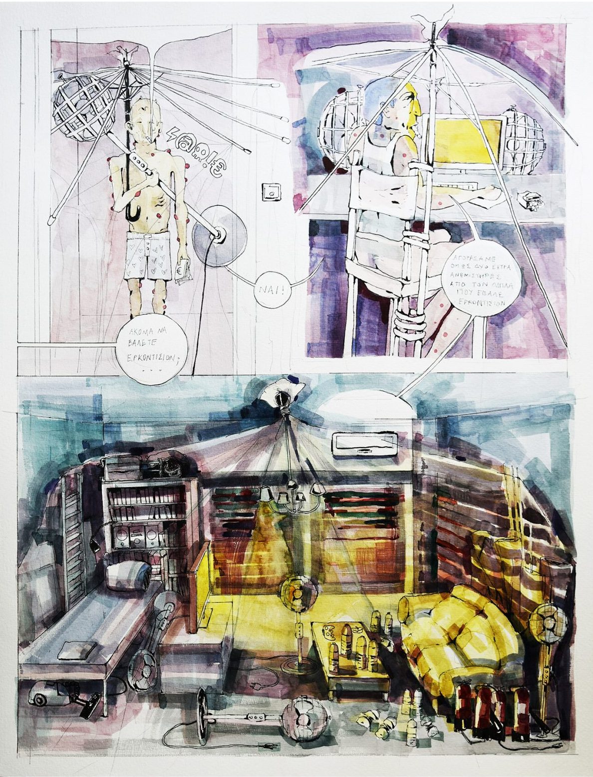 Using ink, pencil, and collage, he constructs layered compositions that emphasize both materiality and immediacy, bridging architecture and storytelling. Each panel functions as a fragment of a larger conceptual exploration, where spatial logic, visual rhythm, and narrative coherence converge. In this way, Paschalis bridges the disciplines of architecture and comics, demonstrating how narrative strategies can expand architectural thinking beyond conventional modes of representation.