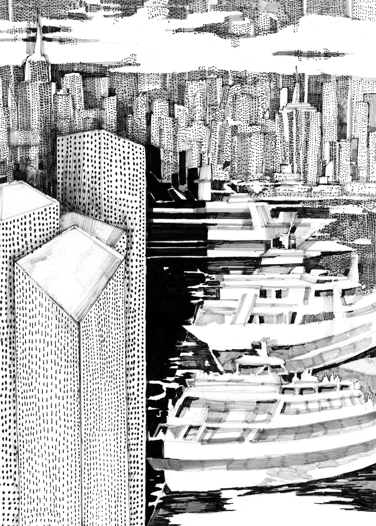 In this work, the characters live a sick routine in their city. They live in skyscrapers and drive cars. But some experience better living conditions on the roofs of skyscrapers, where there is nature, single-family homes and swimming pools. The people at the bottom of the city watch the lives of those at the top, on their mobile phones. Everyone dreams of one day living at the top of their city that they have not had access to until now. The competition is extreme because everyone has the exact same dream.