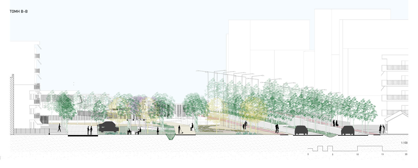 The main straight route, accessible to all, was formed along Akriton Street and meets each of the designed areas either by passing through them centrally or from the side. Alongside this, an open artificial drainage channel follows, both to restore the trace of the torrent that existed and to collect and reuse rainwater.