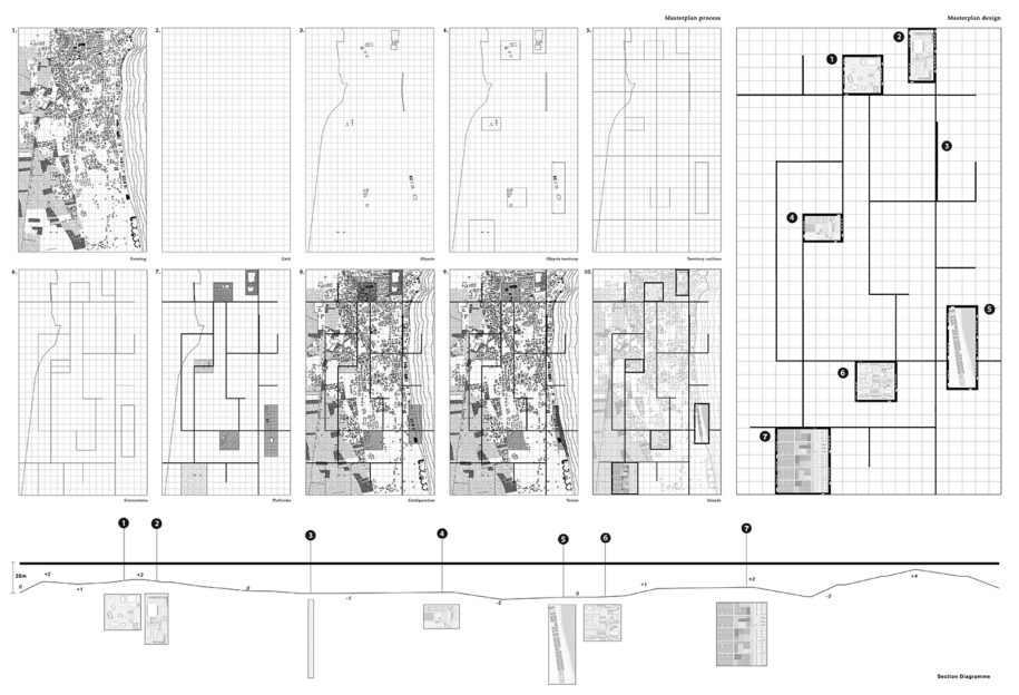 In the next stage, the islands were redesigned, however they retained some of their original elements in order to preserve the memory and the image of the past. Then, among the islands, the idea of urbanization evolves as an ocean of objects, nature, ruins and memories, which creates the ground of the new urban condition. Finally, taking as a basis the enclosed character of the existing city, the idea of the wall is reproduced, and adopts beyond the limit and the idea of connection and traffic.