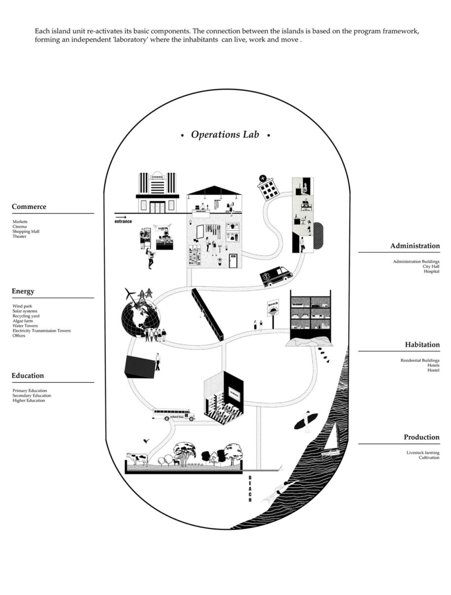 According to Pier Vittorio Aureli, the archipelago refers to a specific architectural form that is a counterform within and against the totality of urbanization. Subsequently, the centers of this system are the bases of interest, in other words, the islands of this urban archipelago complete the concept of autonomy. These states of exception compose the city’s machinery and every one of them consist a self – sufficient enclave that by retaining its function can host any ideology without affecting the general principal of urbanization. Each island adopts its function according to the previous urban status, and all together compose a new urban reality.