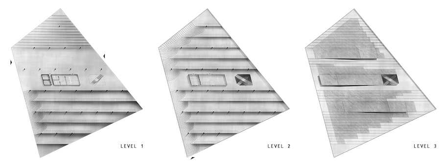 The third level is the education center, where three linear sections of the platform house road safety workshop classrooms. This level functions as a raised plaza, public meeting point, and urban garden overlooking the city.
