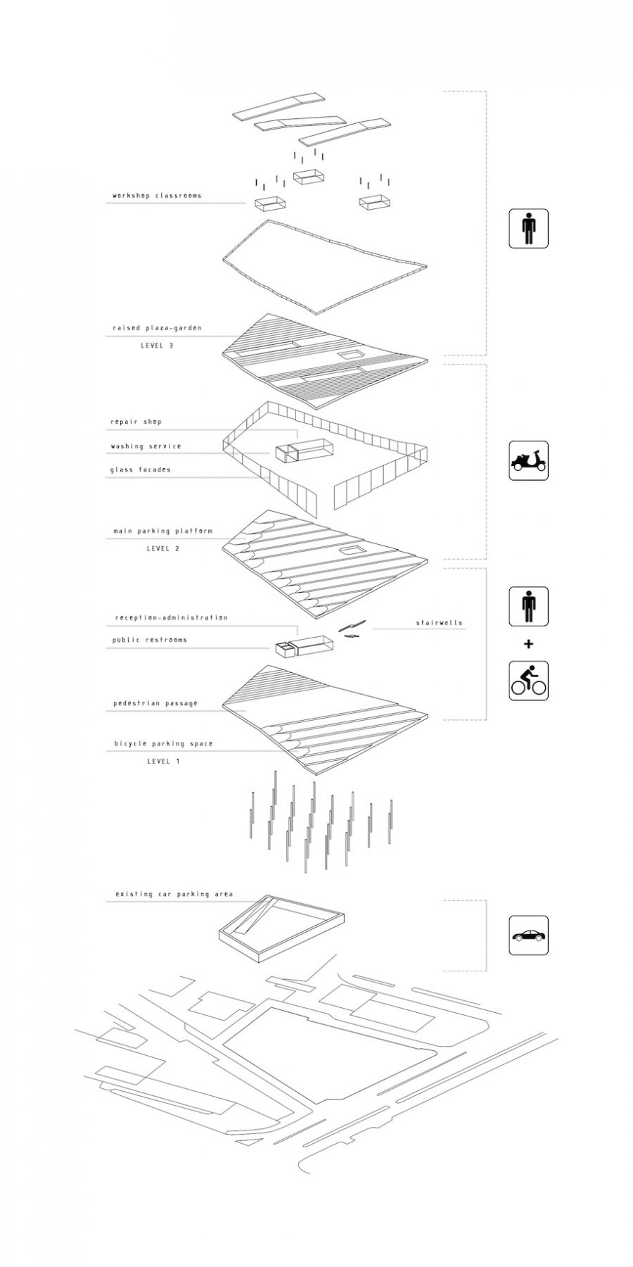 The second is given completely to motorini, with the main parking platform splitting into twelve large steps where over 1000 parking spots, a washing service, and a repair shop are placed. For the motorini and bicycles’ circulation a unique version of a slope is designed – two vertical ramps merged into one ‘‘hill’’ that provides the ability to drive towards multiple directions.