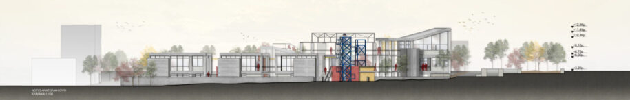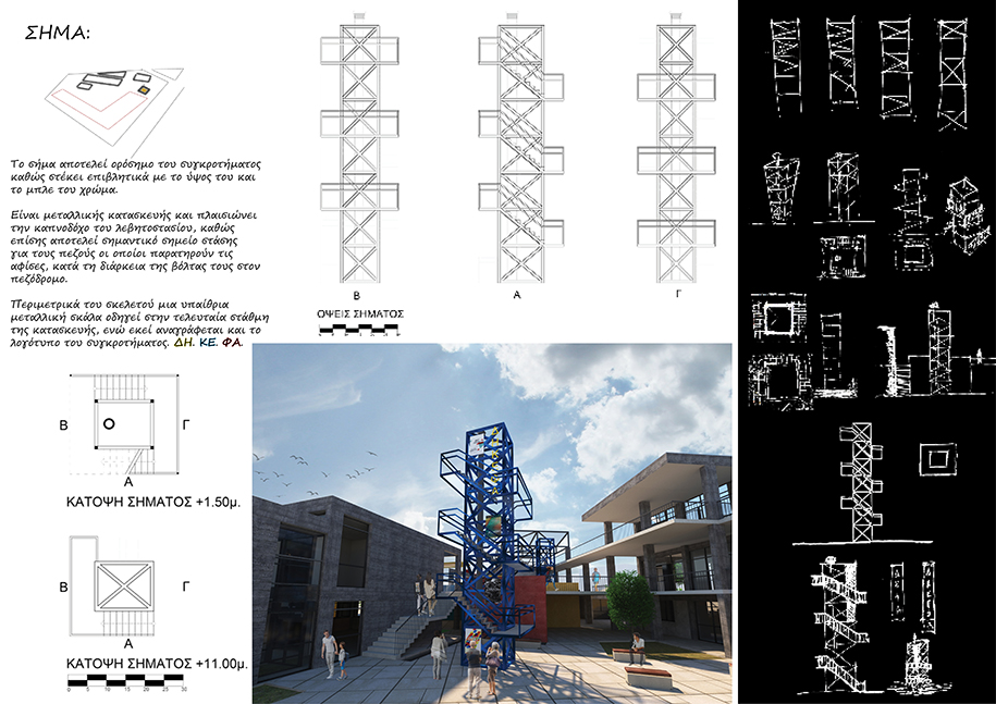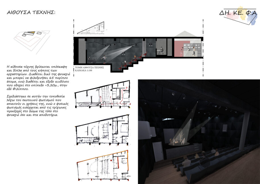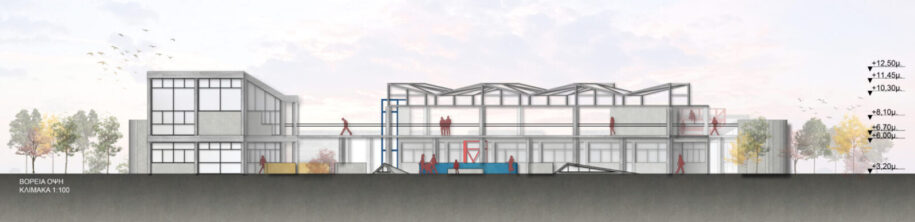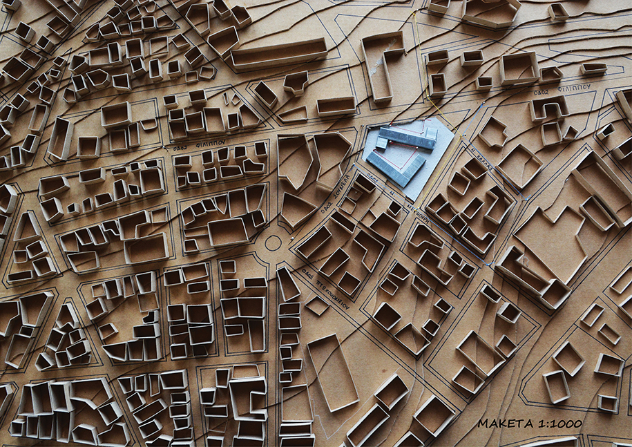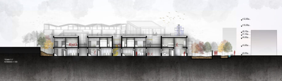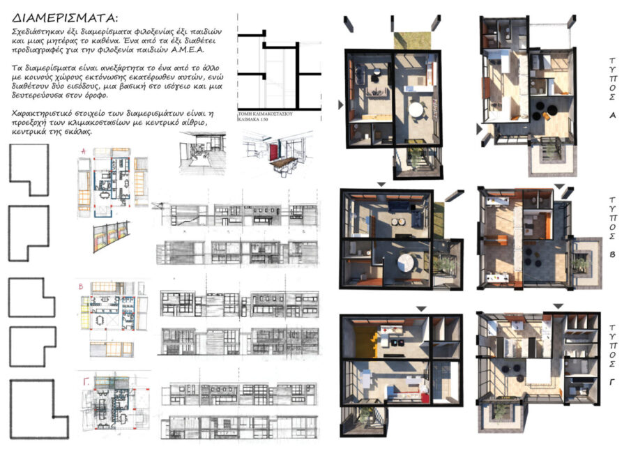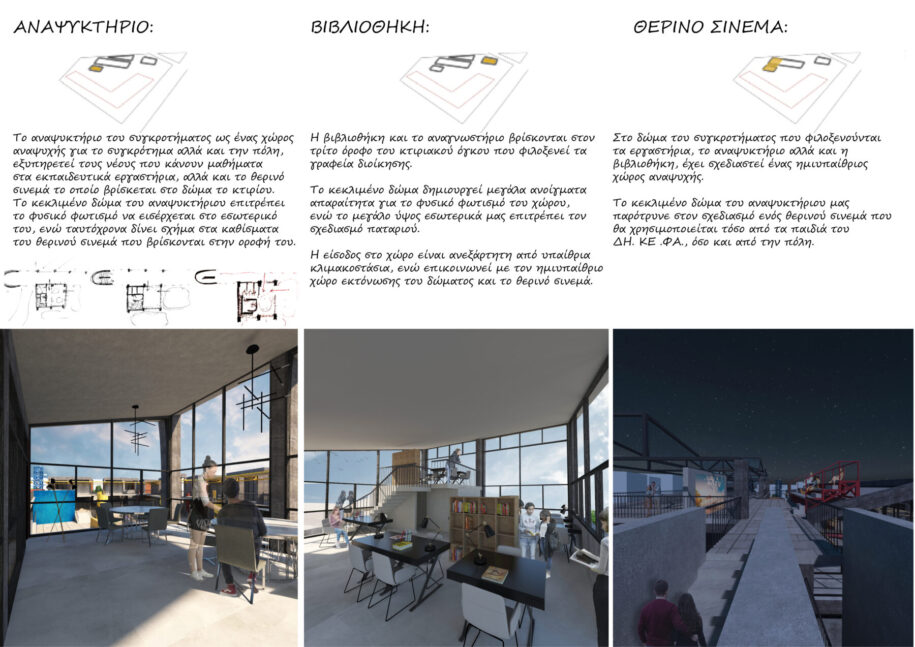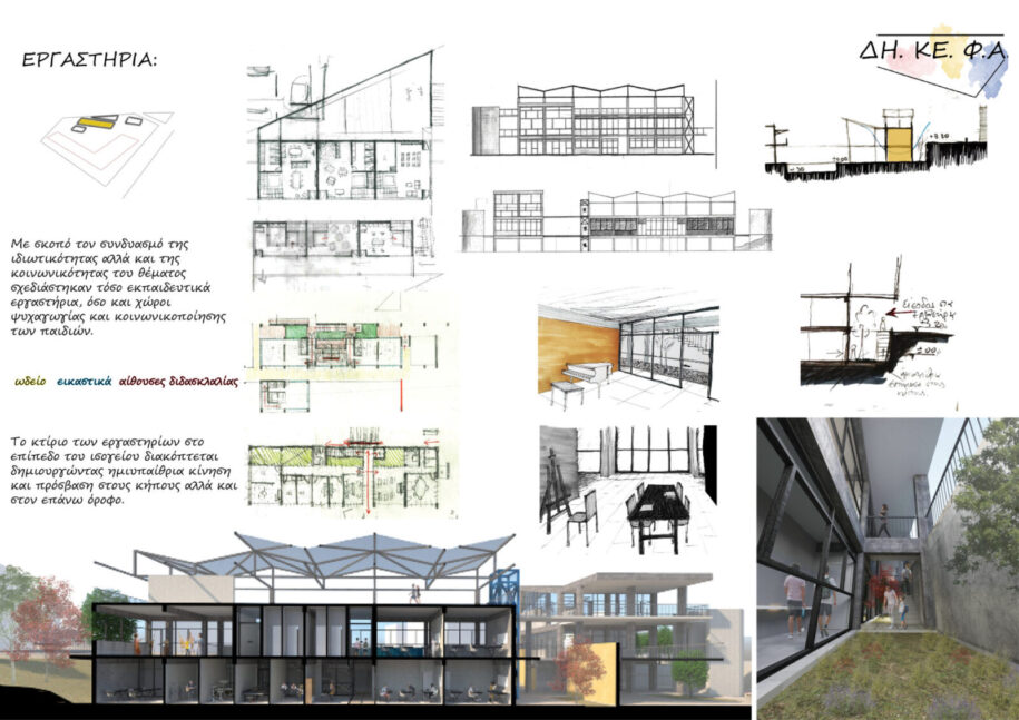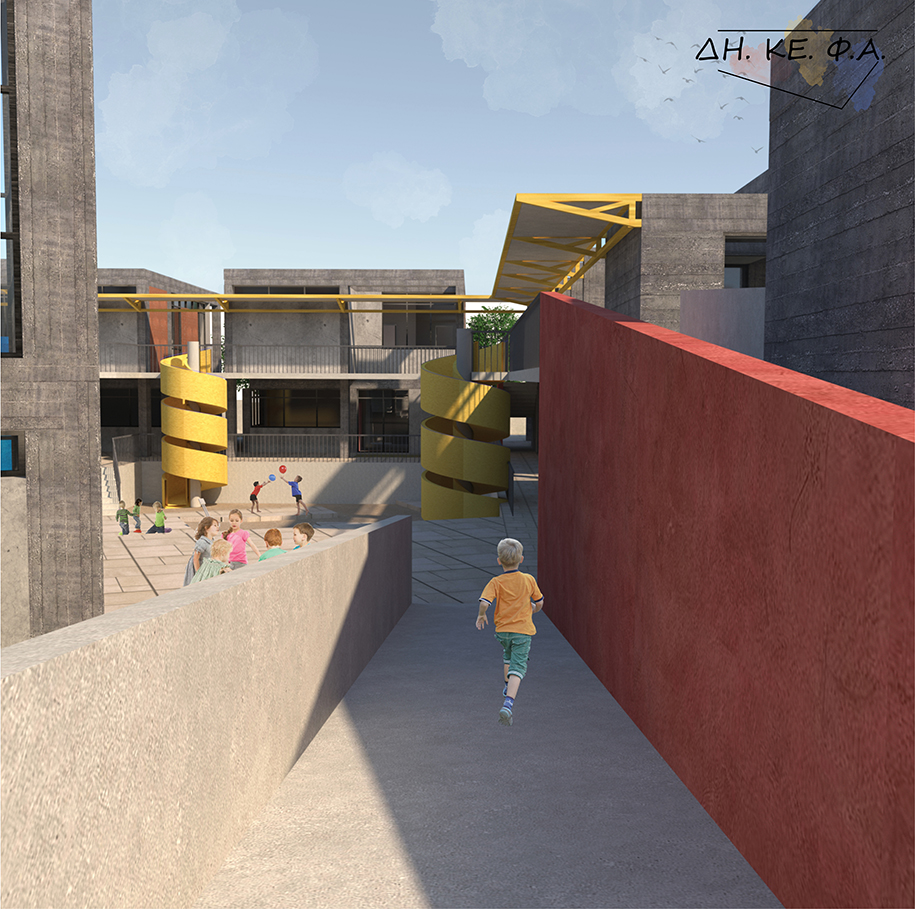 The workshops concern classrooms, an art workshop and a conservatory. They are designed so that one can have access both from inside the complex and from the main road, since it concerns the employment of children of the complex and the city in general. It has entrances on both levels, while they have direct contact with the bar. The theater hall is located underground under the open front of the main road, forming on its roof triangular ends for the penetration of light, while a small square is formed. The office building concerns the offices of administration, social worker, psychologist, doctor, as well as on the top floor a library and reading room has been designed with independent external access.