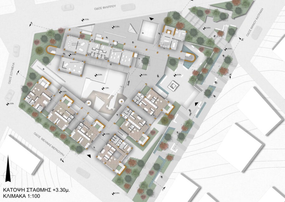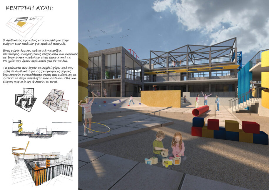 The placement of the uses of the complex concerns the orientation as well as the height differences of the plot. The central courtyard, a key feature of the complex has been placed inside the buildings and is located at a lower level as far as children’s entertainment is concerned, while the buildings around it form a hug thus giving a more introverted character to the center of the composition.