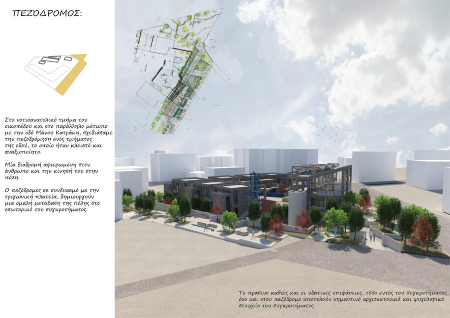 Ο σχεδιασμός του συγκροτήματος αφορά επισης και την ανάπλαση ενός πεζοδρόμου πλευρικά του οικοπέδου δημιουργώντας μια εννιαία αντιμετώπιση τόσο στο ίδιο το οικόπεδο όσο και στην ευρύτερη περιοχή.