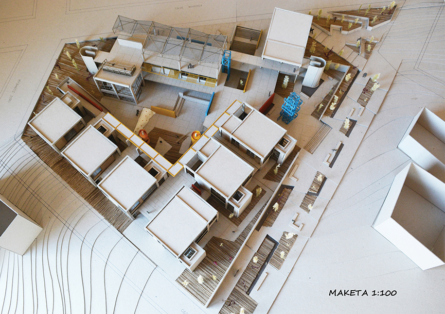 The plot is located within the urban place of the city. In this area there are school facilities, sports centers, office buildings, residences and parks. The design concerns independent accommodation for children in the form of a family of 6 children and a mother. The building program has 6 houses of 2 floors, office and doctor’s office building, theater and summer cinema, educational workshops and a cafe.