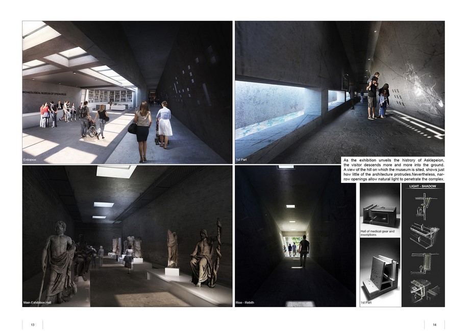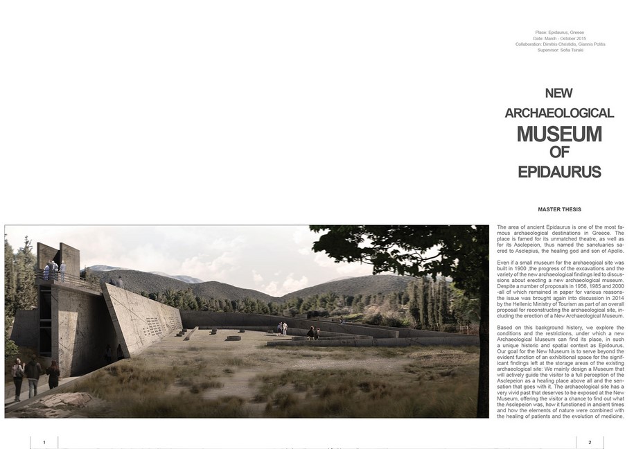 The diploma thesis of Dimitris Galetakis, Dimitris Christidis and Giannis Politis entitled “New archaeological museum of Epidaurus” was presented in October 2015 at the School of Architecture of NTUA and was supervised by Professor Sofia Tsiraki. -text by the author