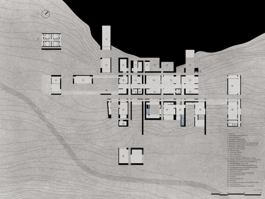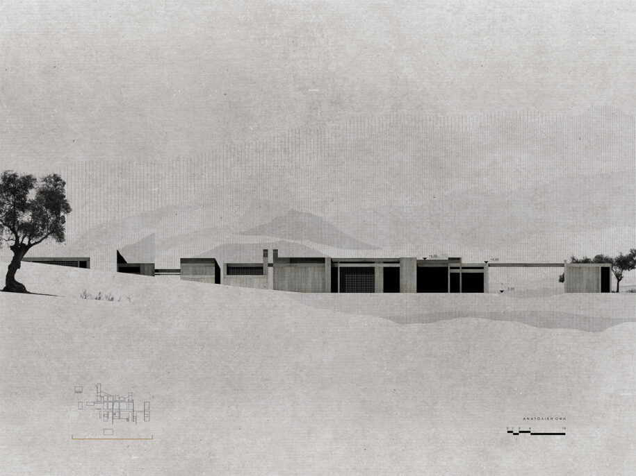 The result of tourism development is the absence of an olive mill from the island. Before five years, the last olive press in Skiathos island has been closed, and residents are forced to transport tons of olive crops to Glossa, an area in Skopelos island, by ship in order to produce their olive oil, because there is the nearest olive mill in Skiathos island. This is an expensive and a tedious process for the Skiathos olive growers and destructive for the quality of the olive oil. The synthesis of the olive mill is organized in three thematic zones: the storage and auxiliary zone, the production of olive oil zone and the visitors zone.