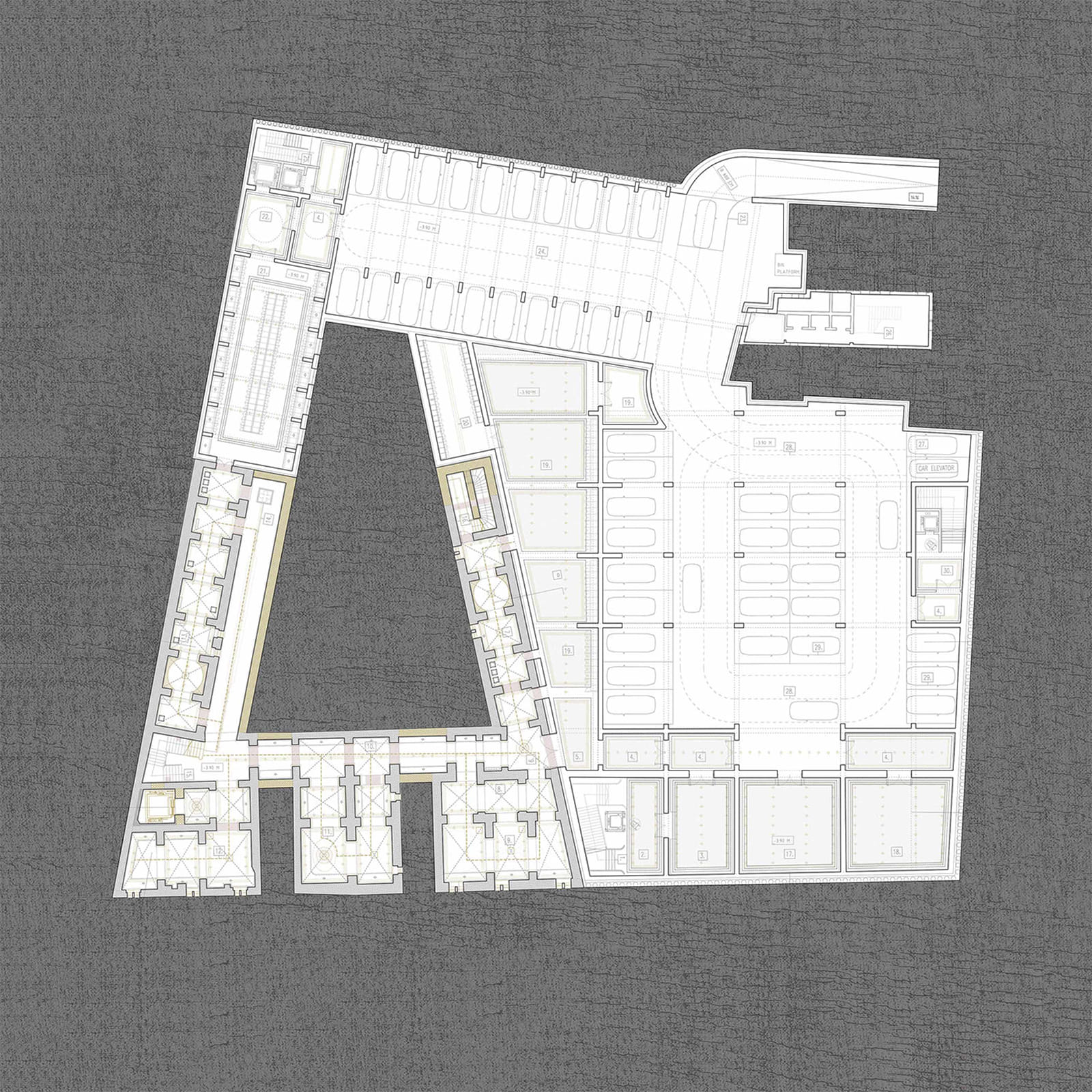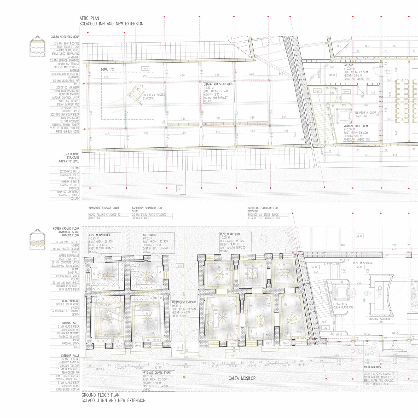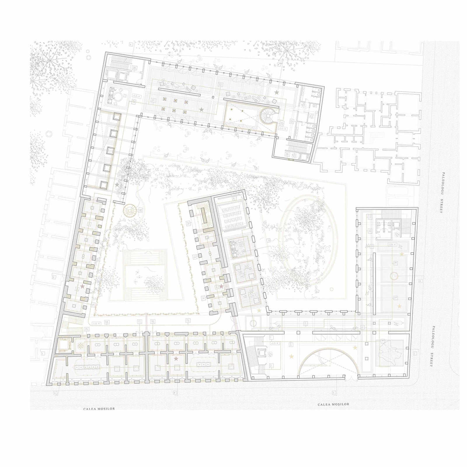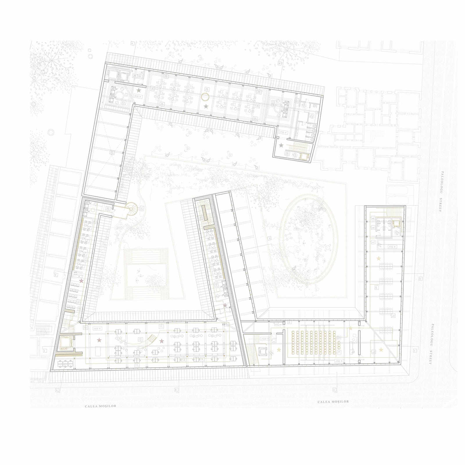The upper levels, open to the inner courtyard, are designed for museum galleries, and related functions: a hub for students, art and restoration workshops, and a conference room.