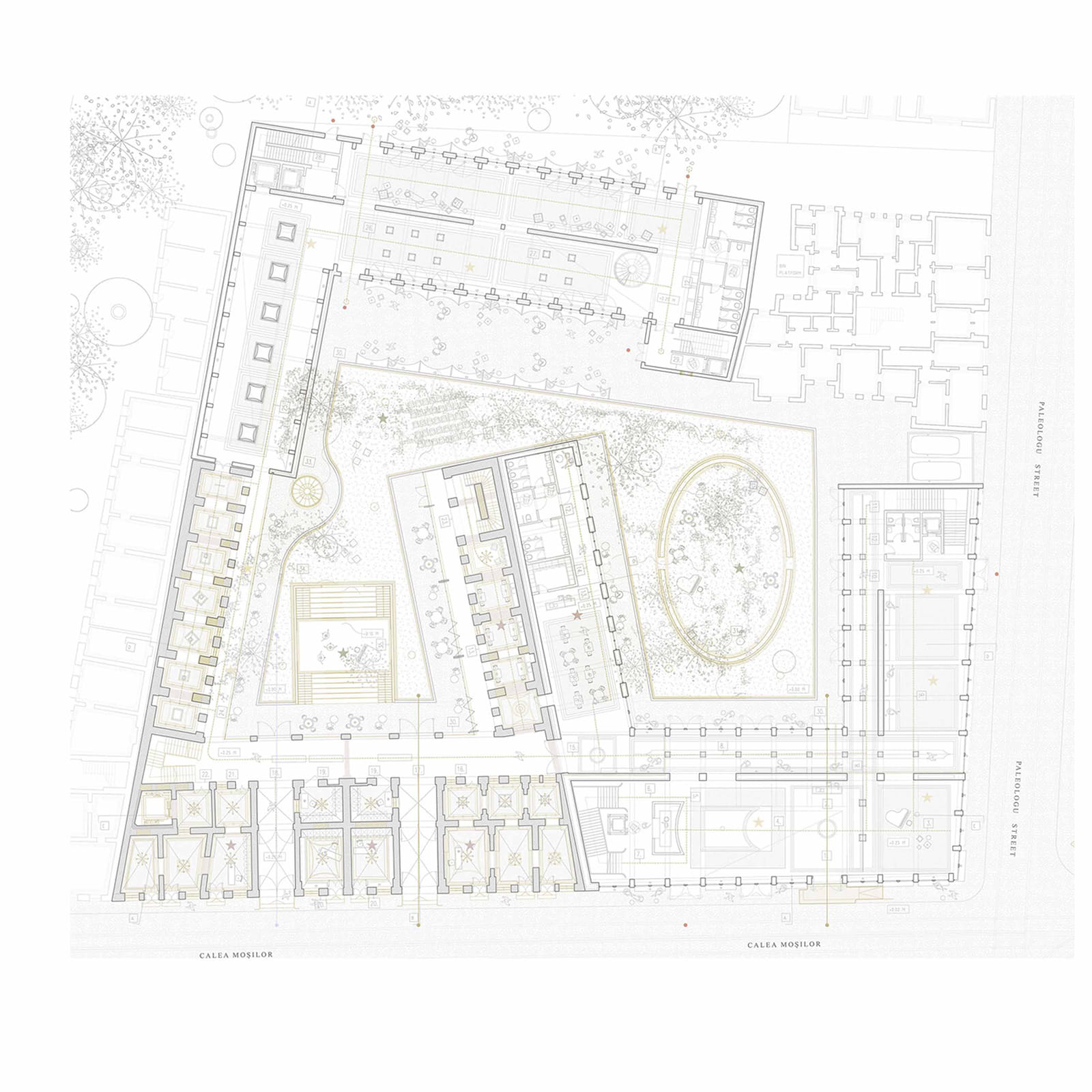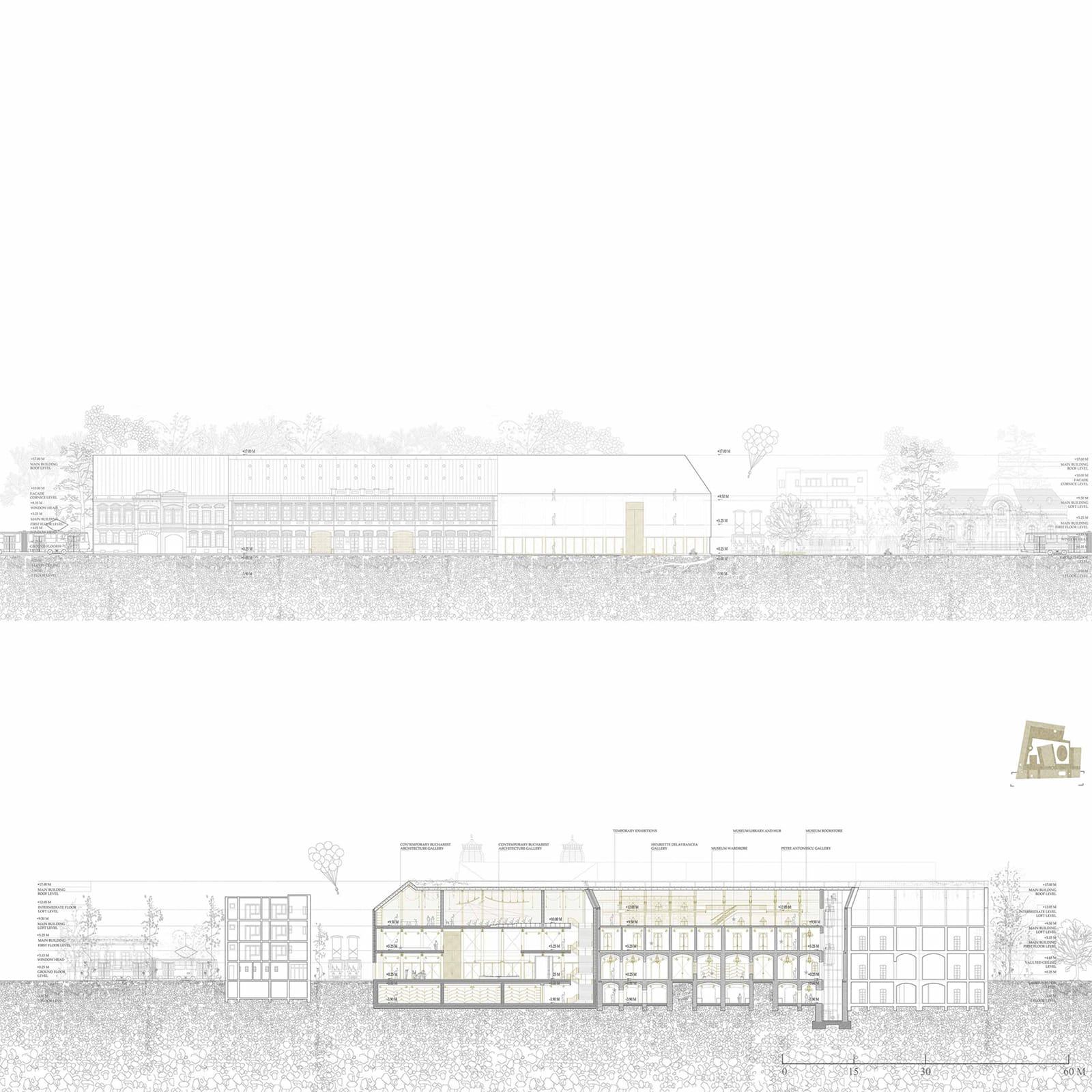 The challenging site poses an opportunity for delicate insertions and interventions on the deteriorated and disjointed site. Reclosing the linear street profile and reclaiming the spatial typologies, such as the portico, the atrium, the vestibule, garden, and sloped roof attic spaces, draw reference from medieval inns and urban “caravanserais”.