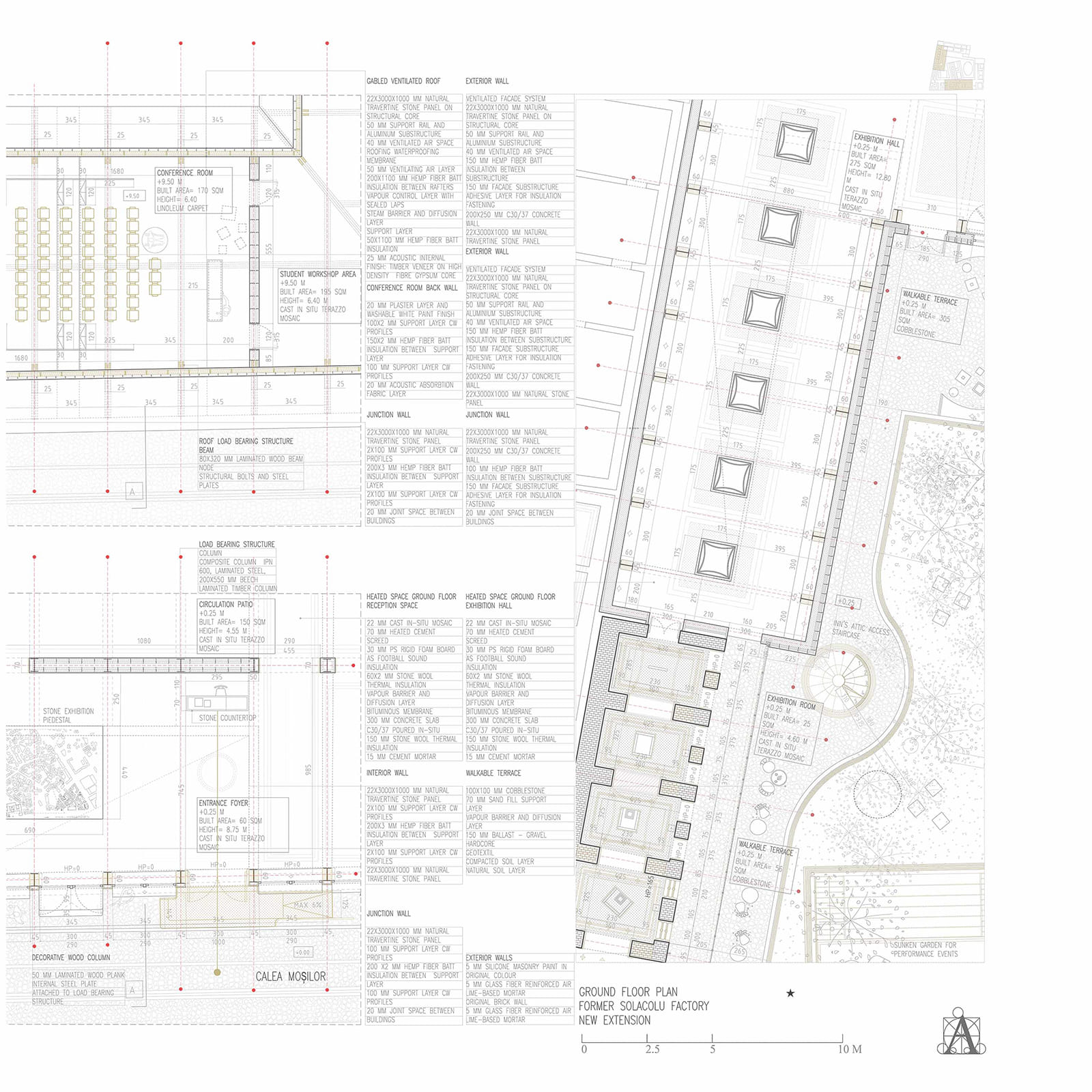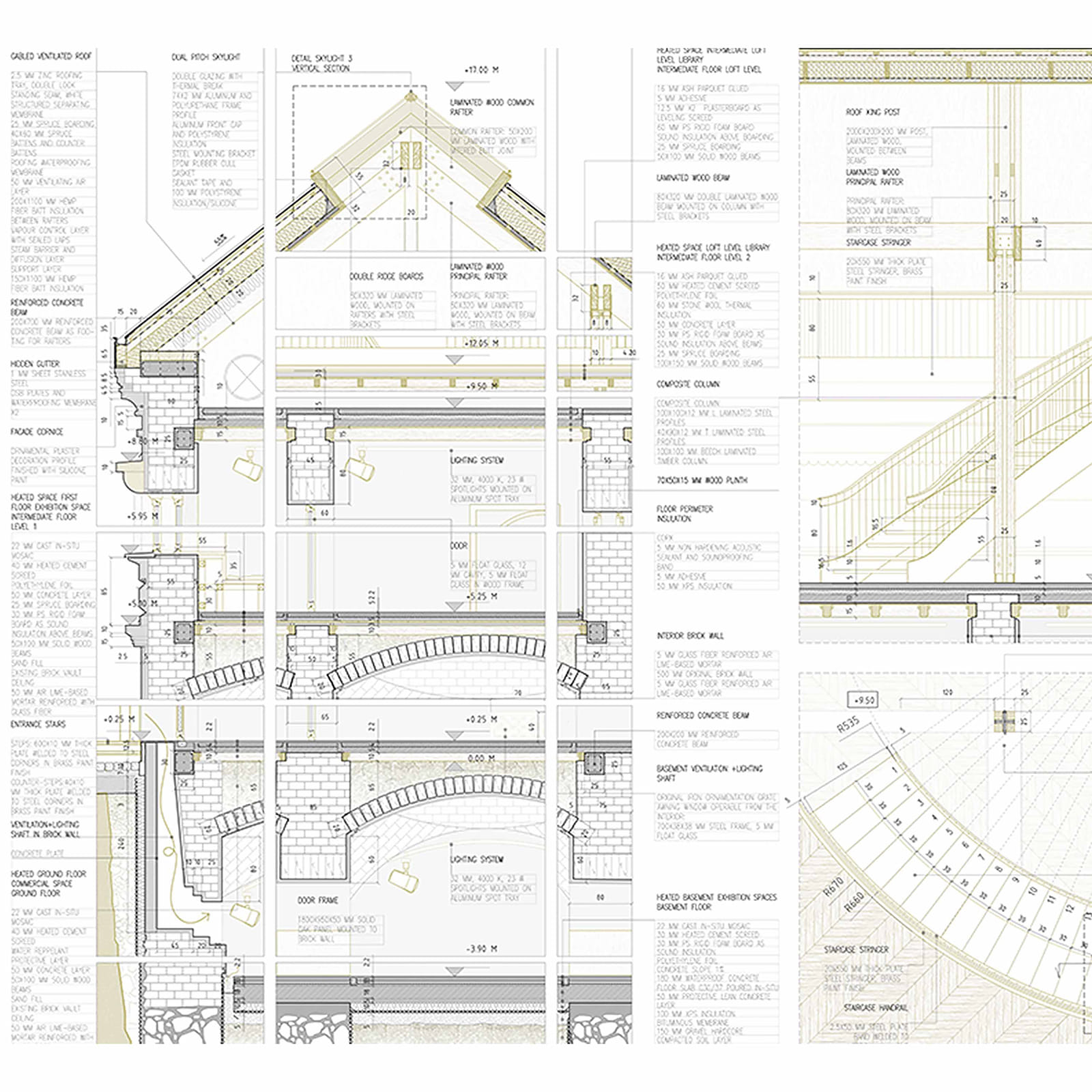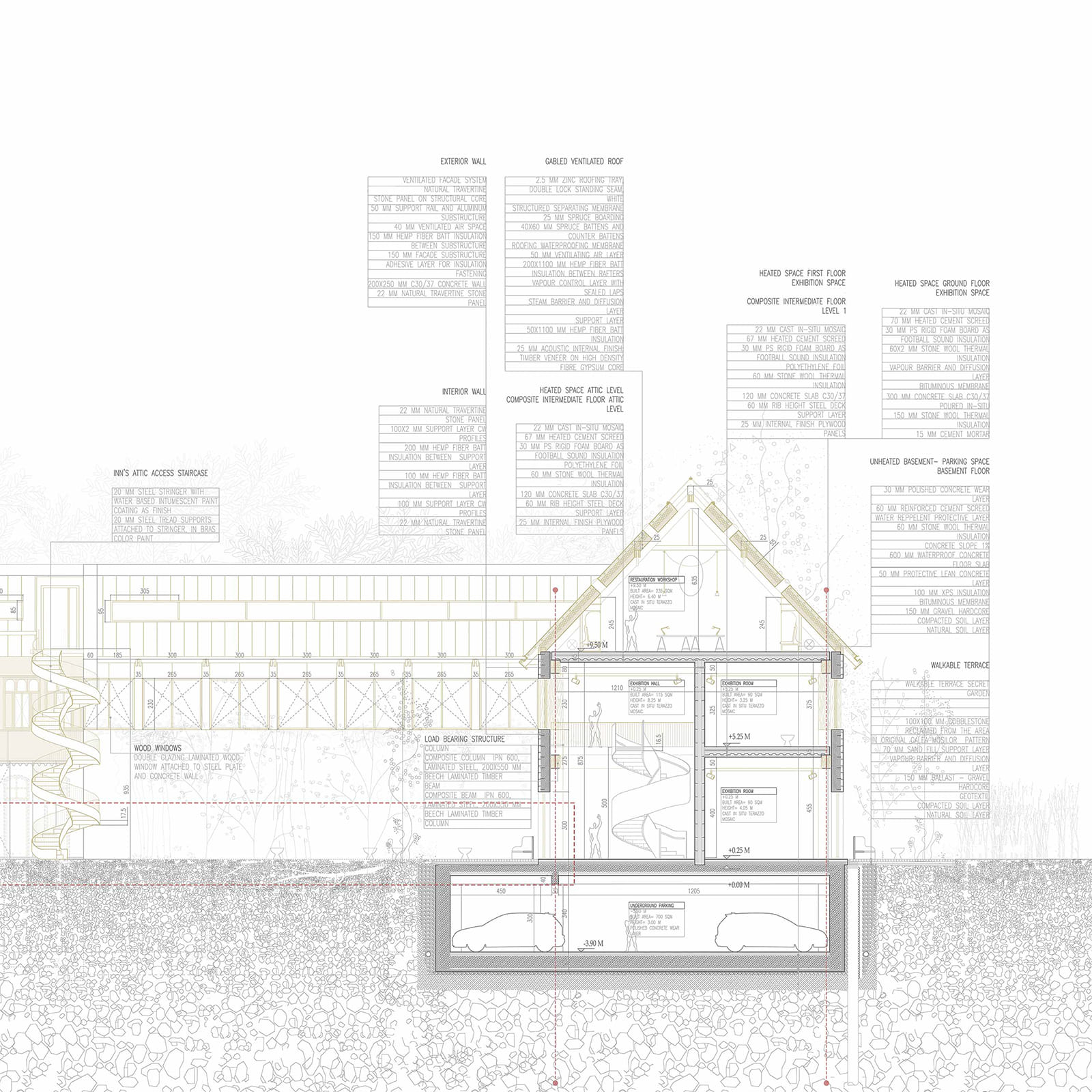 An ecology of protection, memory, and reuse is demonstrated by the envisioned innovative hybrid structure of laminated timber, steel columns, and the rear ventilated stone façade, focusing on blending heritage preservation with contemporary use.