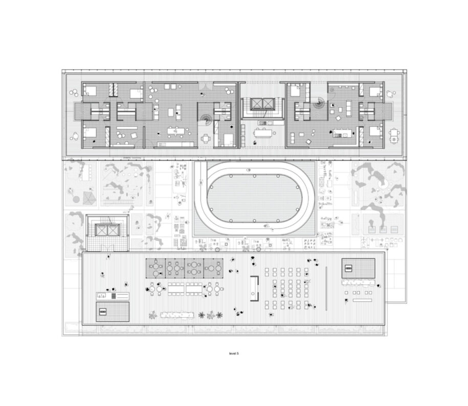 Πάνω από την δημόσια πλατεία, γύρω από τα δύο υπάρχοντα κλιμακοστάσια κατασκευάζονται δύο ελαφρείς όγκοι που αφιερώνονται σε ιδιωτικές χρήσεις: έναν ευέλικτο χώρο 500 m2 για δρώμενα/δραστηριότητες και 1000m2 κατοίκησης. Η συνεχώς αυξανόμενη απήχηση της διαβίωσης στο κέντρο, υπογραμμίζει την σημασία της υβριδικότητας στις πόλεις. Η συνύπαρξη κατοικίας και δημόσιου χώρου είναι πιο βιώσιμη. Η ζήτηση αυξάνεται για μικρά διαμερίσματα, κοινές εγκαταστάσεις και υποδομές. Ο 1ος όροφς κατοικίας διαιρείται σε 8 μικρα διαμερίσματα (35m2) ενώ ο 2ος αποτελείται από 2 μεγάλα διαμερίσματα συγκατοίκησης. Ο 3ος όροφος λειτουργεί τόσο ως δομικό σύστημα, αλλά και ως μηχανισμός υποδομής. Παρέχει ηλεκτρομηχανολογικές εγκαταστάσεις και χώμα/γη για την υπερυψωμένη πλατεία ενώ παράλληλα στηρίζει δύο νέα κτίρια κατασκευασμένα από CLT (cross-laminated timber). Αυτός ο στατικός όροφος αποτελείται απο δικτυώματα ύψους 3m που αρθρώνονται στο υπάρχον κτίριο. Τα δύο νέα ξύλινα κτίρια μοιάζουν να ακροβατούν, πρέπει δηλαδή να είναι ελαφριά και να πατούν προσεκτικά σε συγκεκριμένους άξονες και σημεία.
