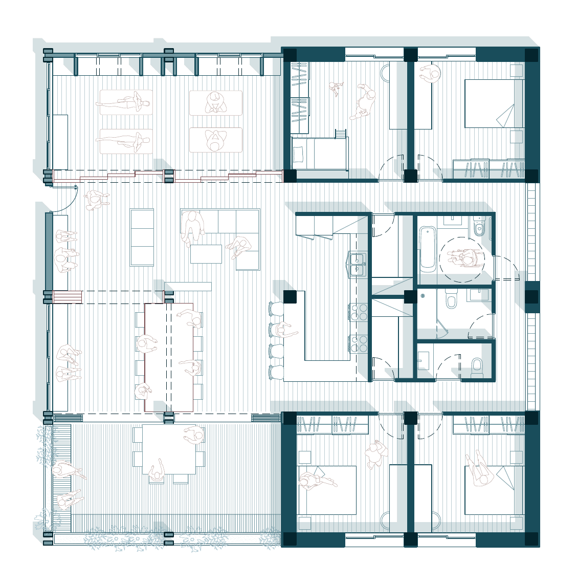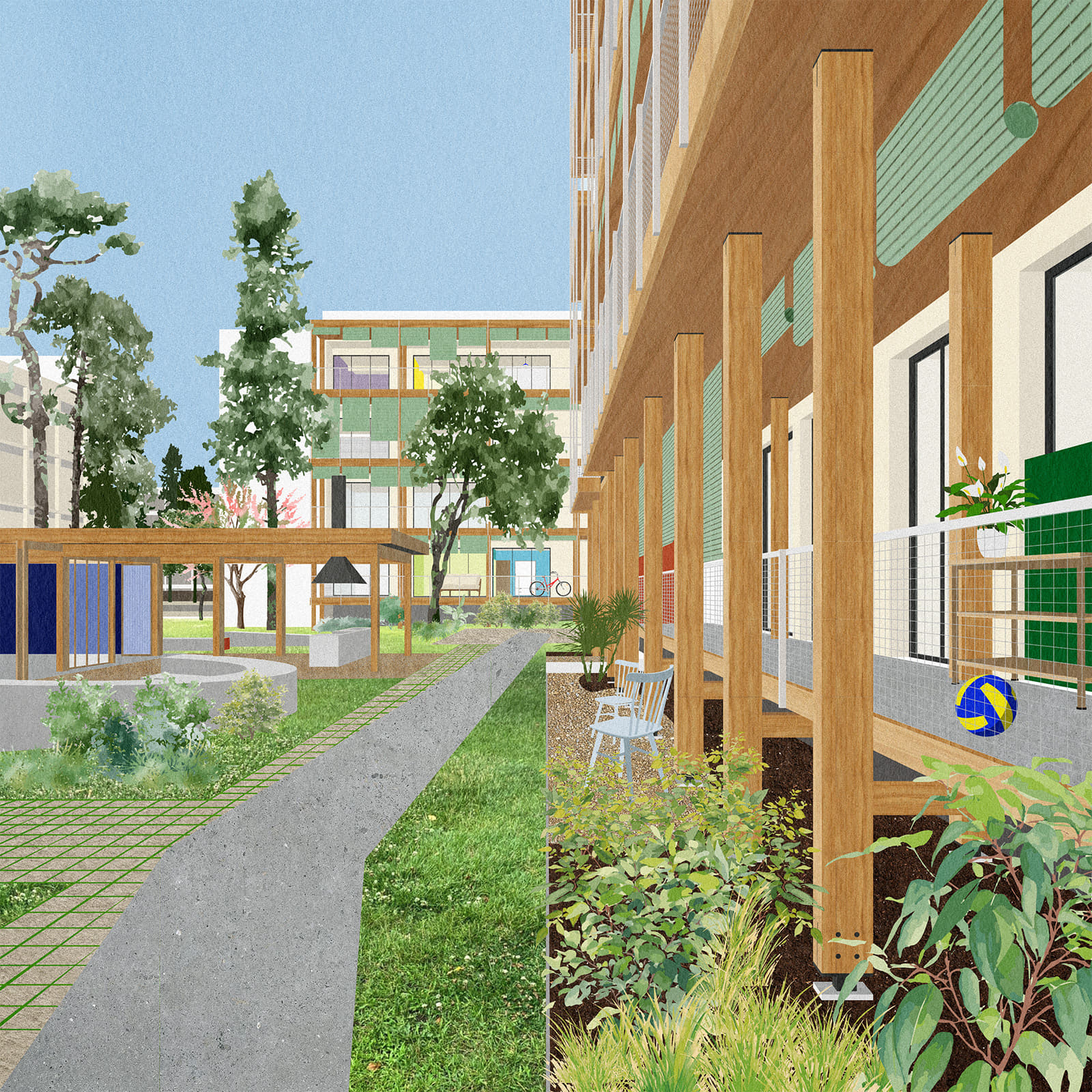 At the same time, gentle interventions are planned in the communal spaces, centered on the creation of a space for the community—a shared space open to all residents.
