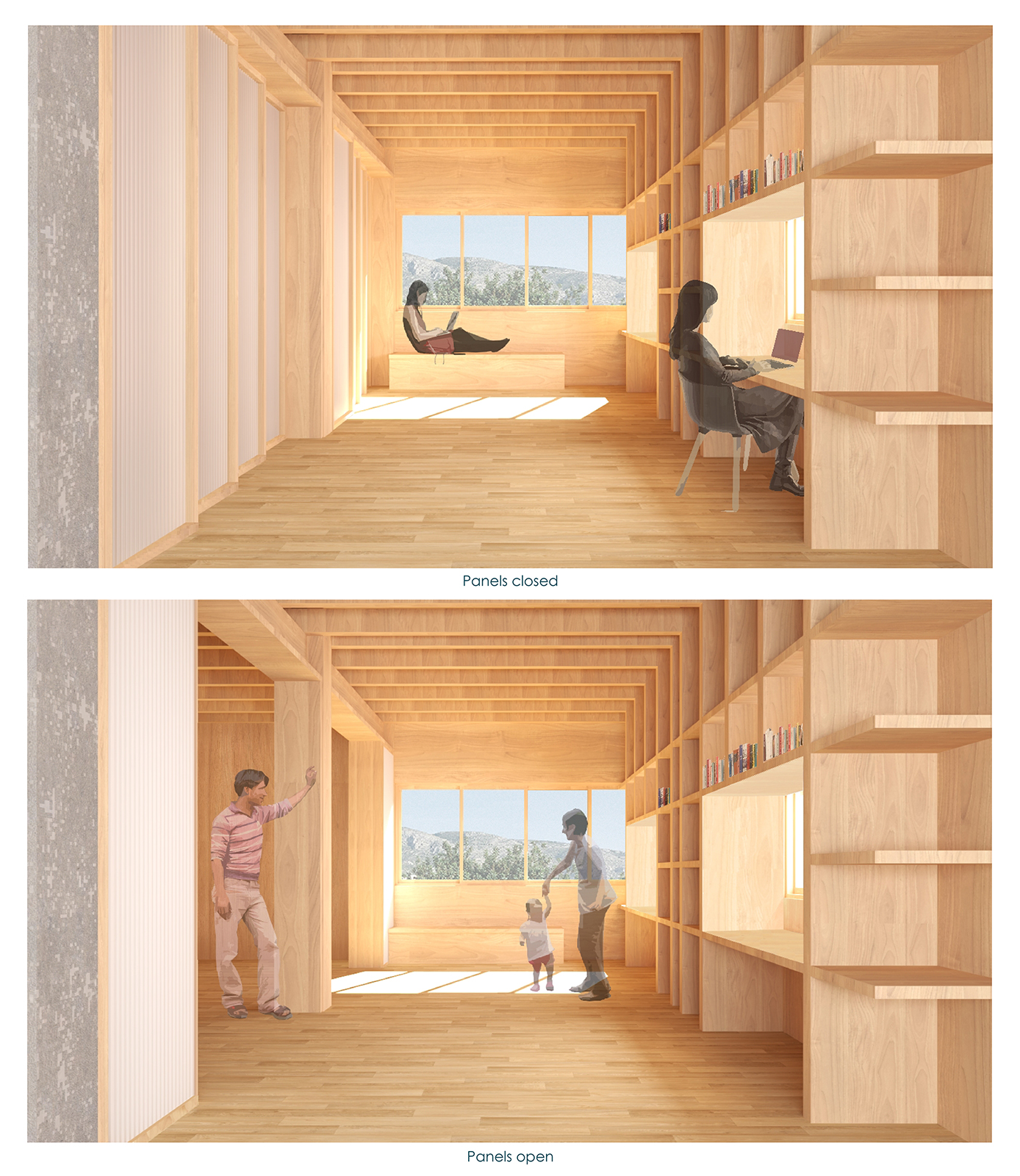 A key proposal is the restoration of the existing structures and the addition of a lightweight, self-supporting CLT (cross-laminated timber) construction on the southern façades of the apartment blocks. This new structure functions as a semi-outdoor space, expanding the area of the apartments.