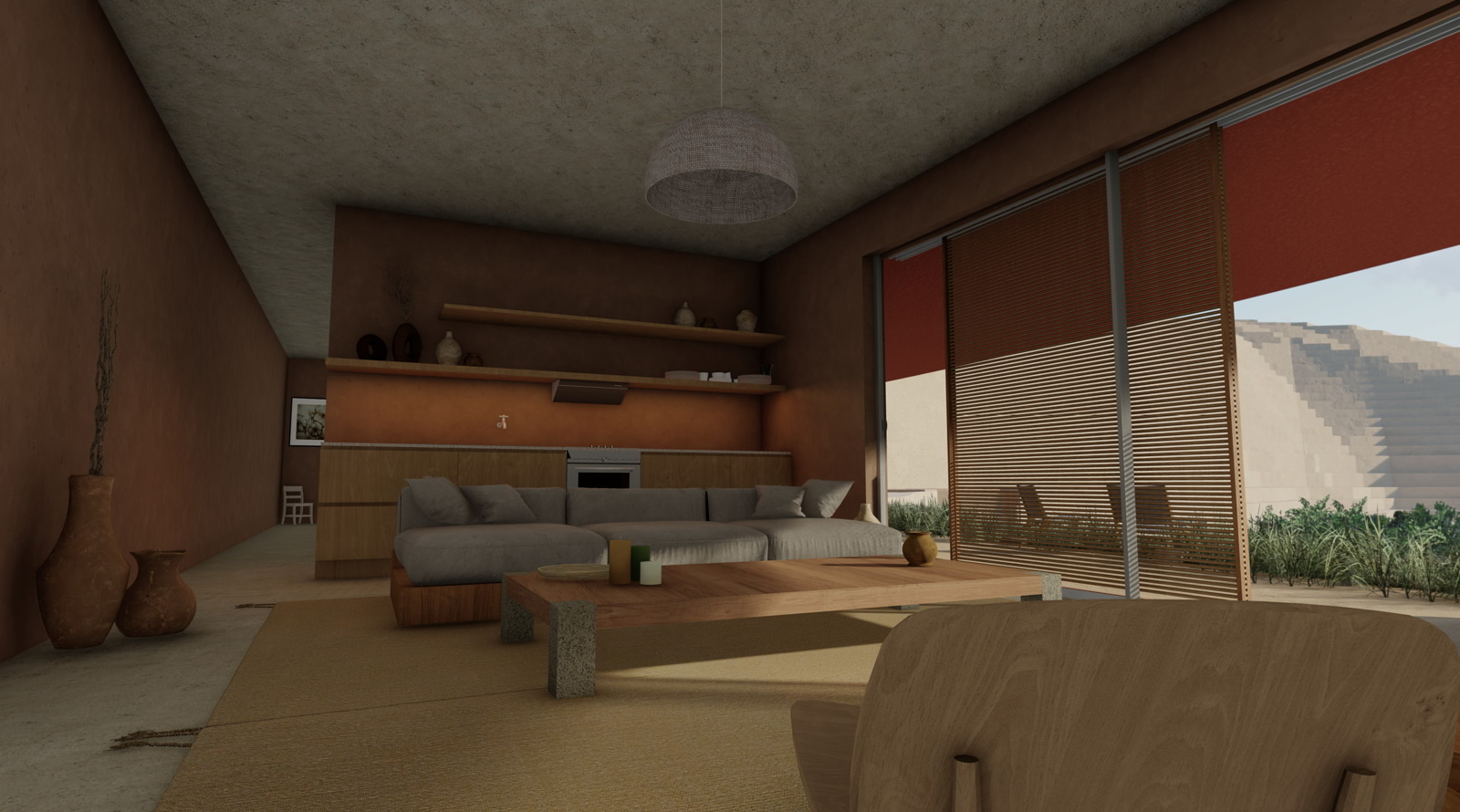 The architecture accentuates the passing of time, using large movable shades in communal areas and materials like rammed earth that organically blend with the environment and modulate light.