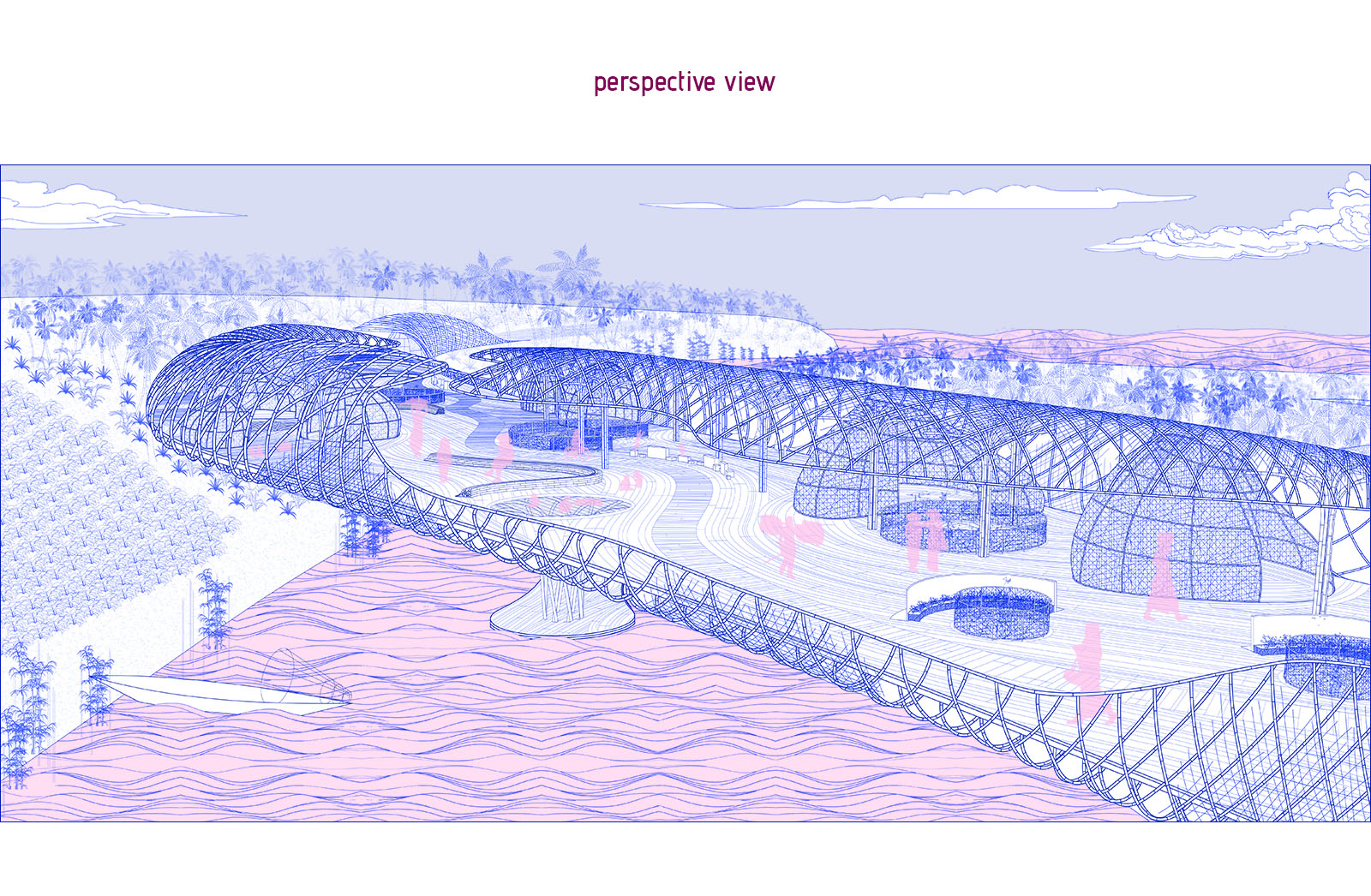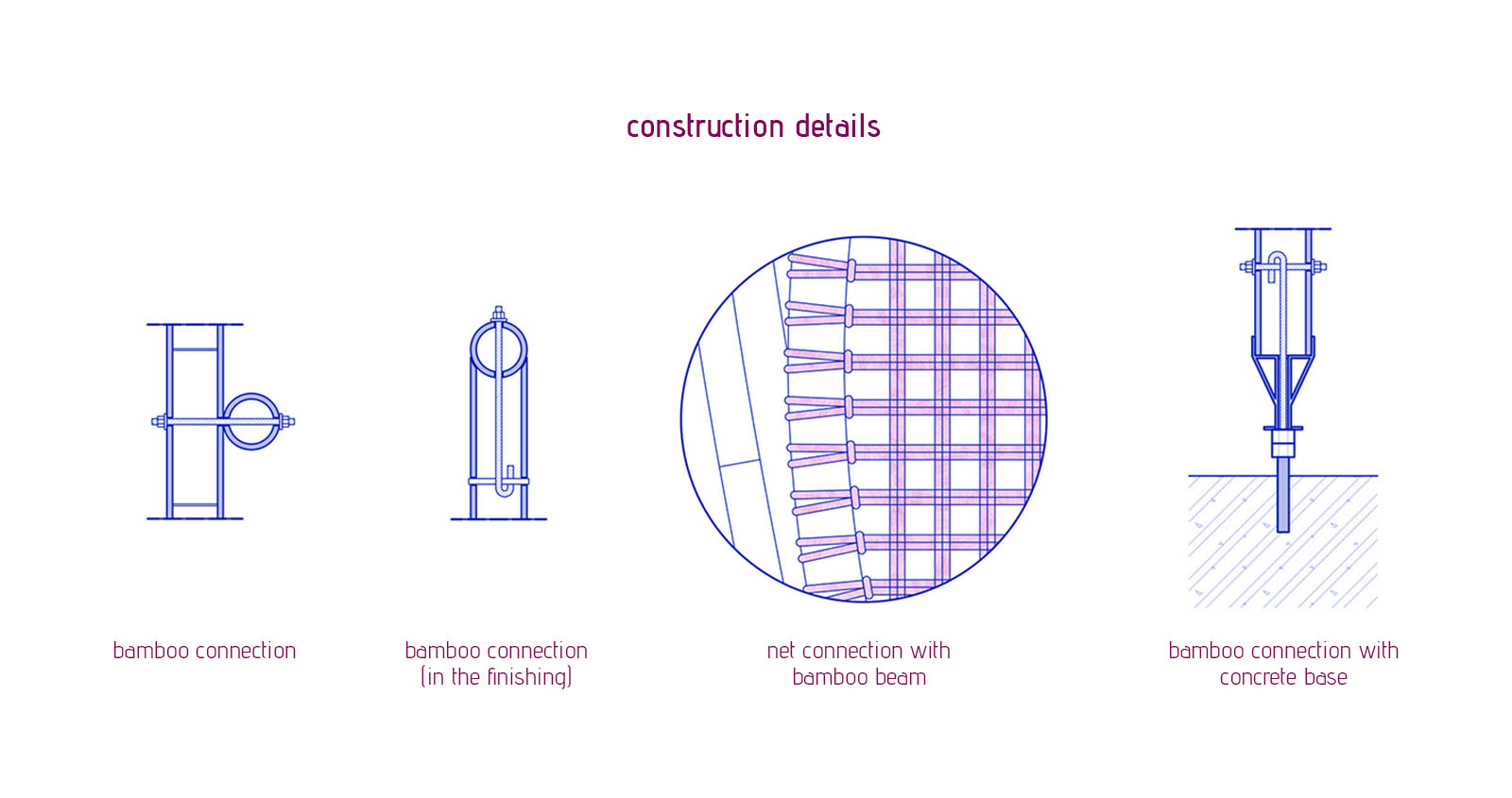 A very important influence on our design project was Myanmar’s tradition of bamboo usage. Due to that, our constructions, like the bridge, the egg-shaped structures and the general equipment, are constructed mostly with bamboo, which is used in different ways with different sizes. On the structures we knit bamboo, with smaller diameters, to accomplish protection from the weather phenomena without blocking the light diffusion.
