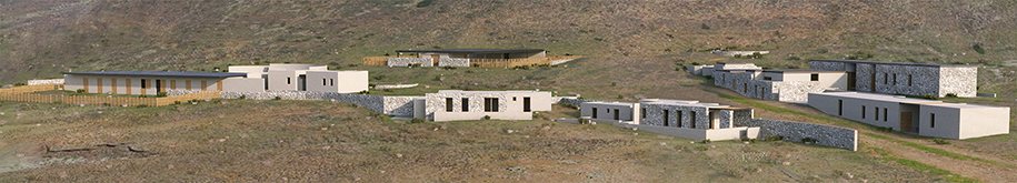 The existing stock of the settlement will host functions of guest houses and visitor service areas. The new proposed buildings will be organized to serve educational activities, auxiliary spaces, a small processing unit for animal products, a horse farm, an animal farm and residences. The functional location of the above aims to separate the uses of production and breeding from the other uses. The existing rural road functions as an axis of spatial separation of the complex into two sections, on the one hand the uses of guest houses, training and processing areas, and on the other hand the residences and the uses of breeding and production.