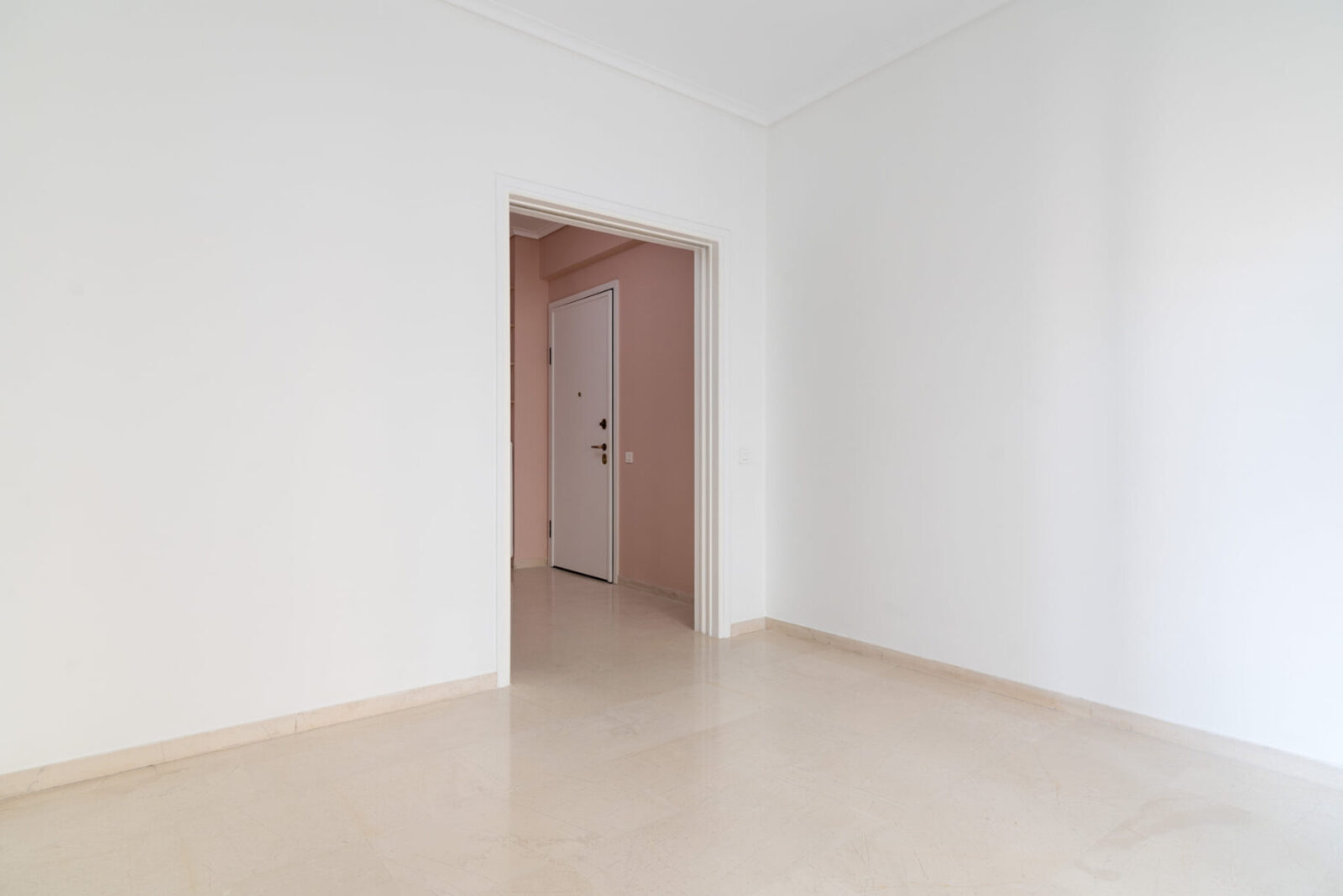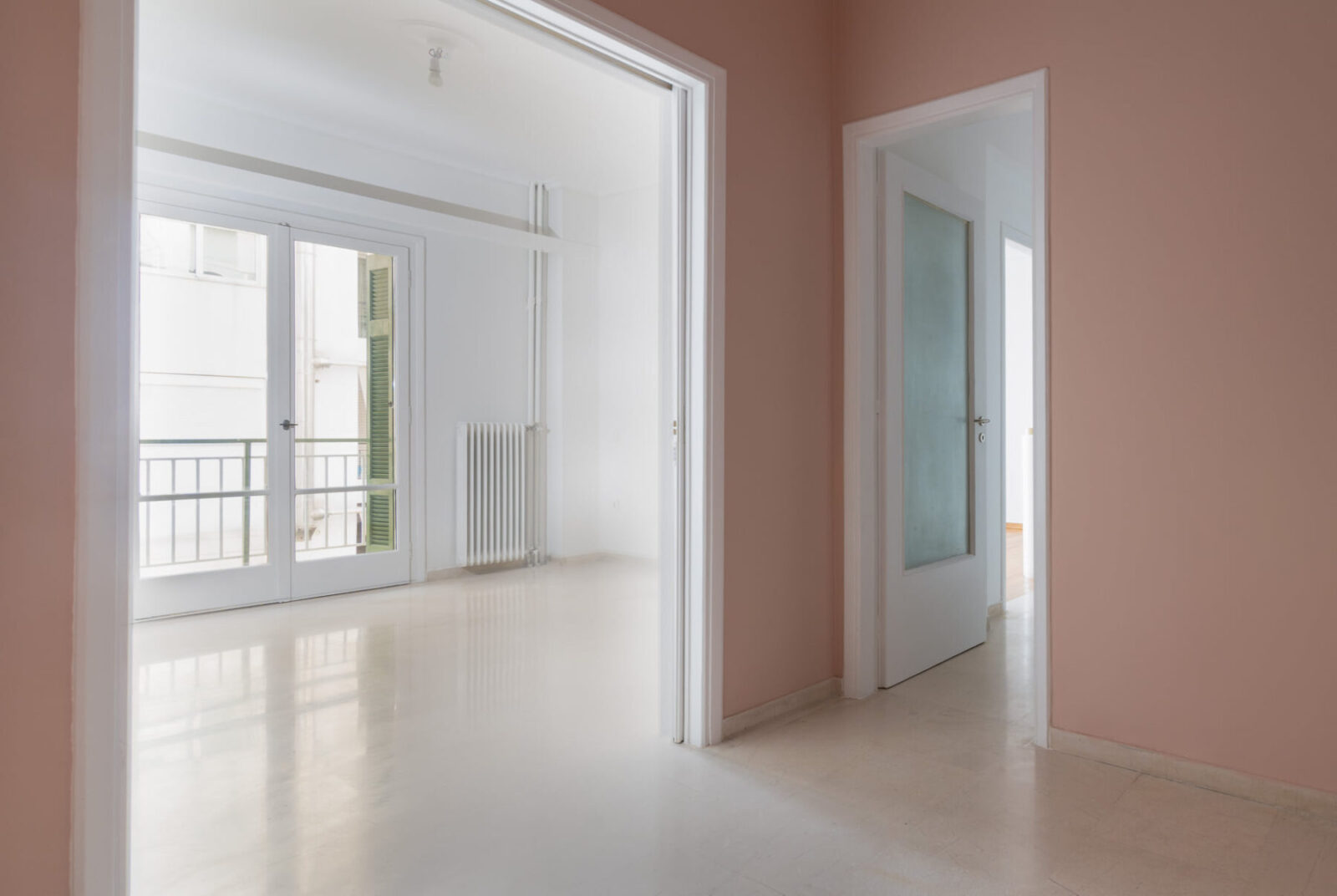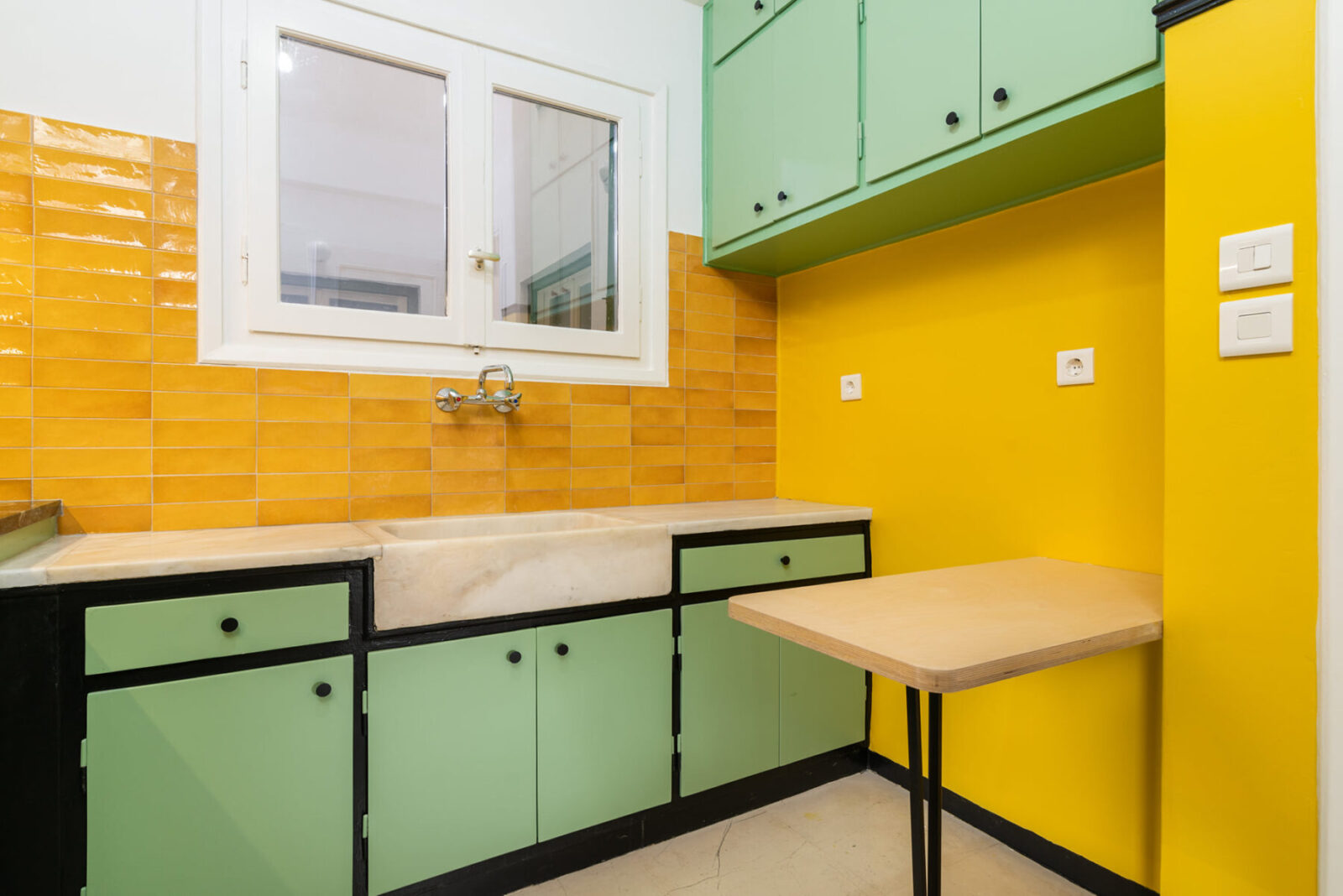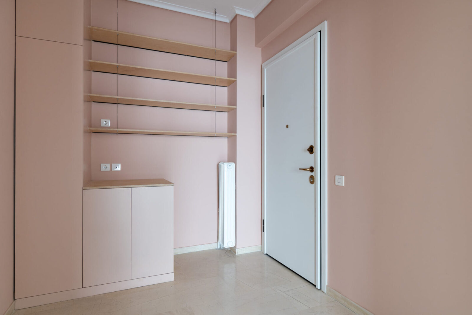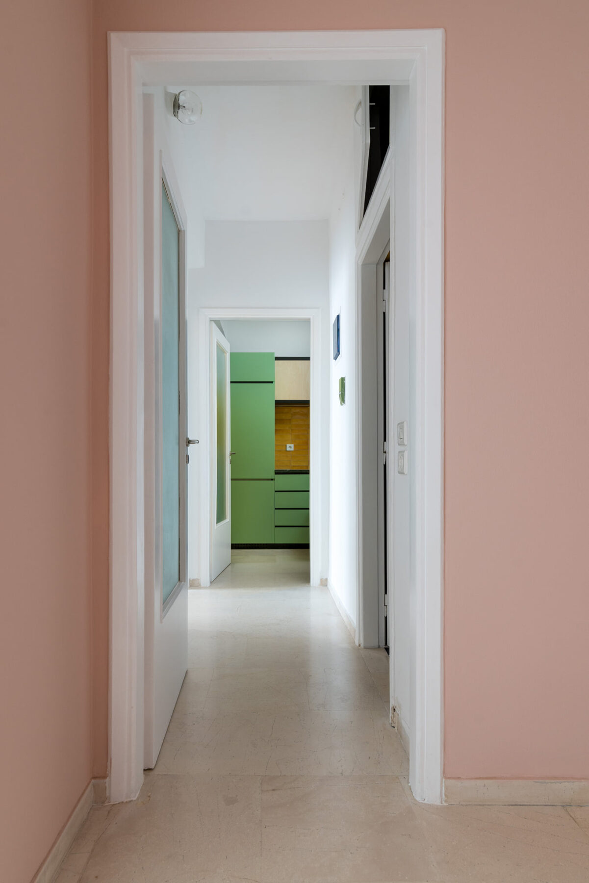The rhythm is given by the old cabinets and the listello on the kitchen wall. The new countertop made of black Tinos marble ‘converses’ with the original white one, the yellow yolk color helps to brighten the dark spaces, always accompanied with a teal color, while the light pink in the hall creates a welcoming intermediate space with a warmer and calmer touch. This pink is tuned with the tone of the original floor made of Ioannina beige marble, very typical in the Athenian apartments of the 70’s and 80’s. The two large bright rooms remain without any interference, just being refreshed and white painted, offering spaces with a totally different atmosphere – neutral and calm.