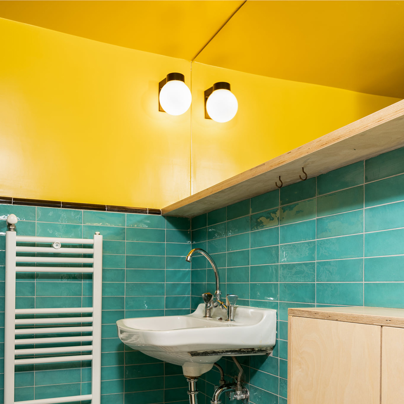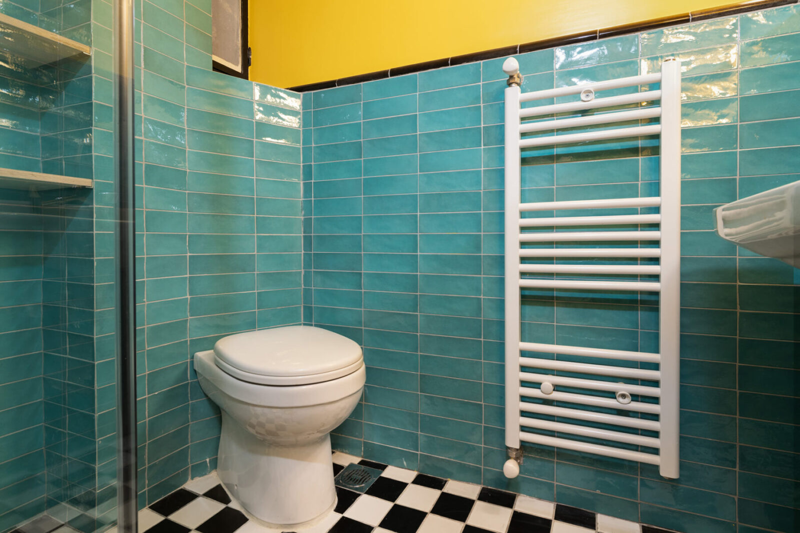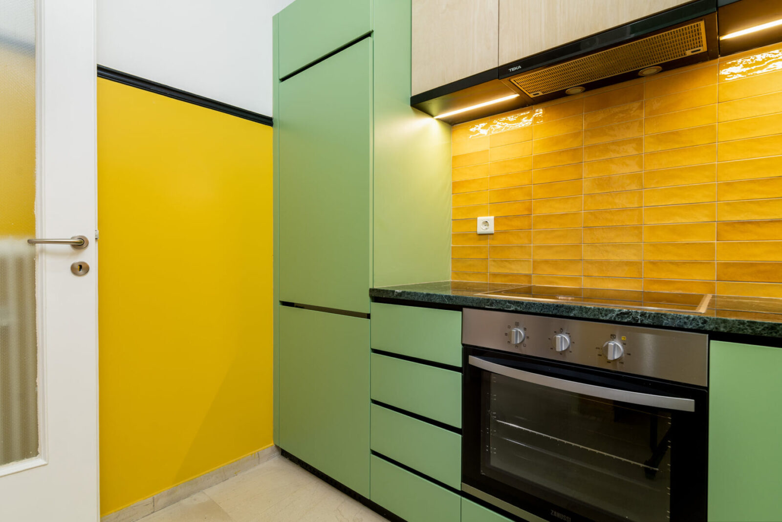 Without any structural interventions (demolition), except a small displacement of the bathroom door, these issues were solved with the colors and the proper organisation of the necessary furnishing equipment for better use of the spaces. The tiny bathroom grows thanks to a big mirror and the displacement of the washing machine into the hall, where it has been hidden within the wardrobe/library. The kitchen cupboard, marble sink and countertop were in a good condition and have been maintained. The new cupboards we added follow a more contemporary structure and design but still relate with the old ones.
