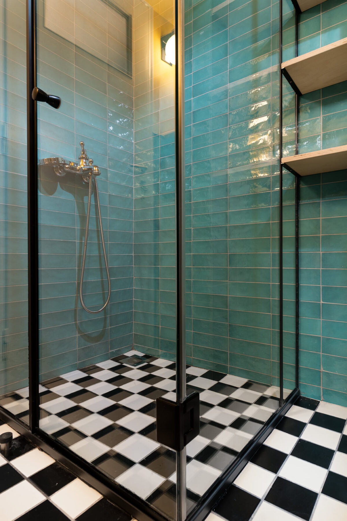 Χωρίς να γίνουν δομικές παρεμβάσεις (γκρεμίσματα) παρά μόνο μια μικρή μετακίνηση της πόρτας του μπάνιου, τα ζητήματα αυτά λύθηκαν με τα χρώματα και με την σωστή οργάνωση του απαραίτητου εξοπλισμού: το μικρο μπάνιο μεγαλώνει χάρη σε έναν μεγάλο καθρέφτη, και την μεταφορά του πλυντηρίου στο χωλ, όπου ενσωματώνεται στο έπιπλο γκαρνταρόμπας / βιβλιοθήκη. Η κουζίνα ήταν σε καλή κατάσταση και ο στόχος μας ήταν να διατηρήσουμε τα ποιοτικά στοιχεία του διαμερίσματος. Διατηρήσαμε τα υπάρχοντα ντουλάπια και μάρμαρα και προσθέσαμε μια νέα σειρά ντουλαπιών στην κουζίνα. Το νέο ντουλάπι ακολουθεί μια πιο σύγχρονη δομή και σχεδιασμό, αλλά εξακολουθεί να σχετίζεται με το παλιό.